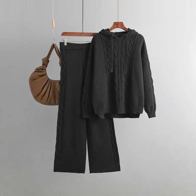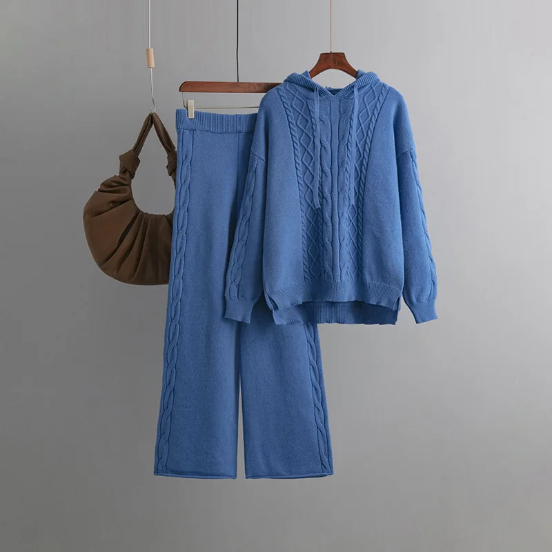 Blubelle Winter Casual Cross-border Euro-American Woven Cable Knit Set Women-Drawstring Hooded Sweater + Wide-Leg Pants 2-Piece