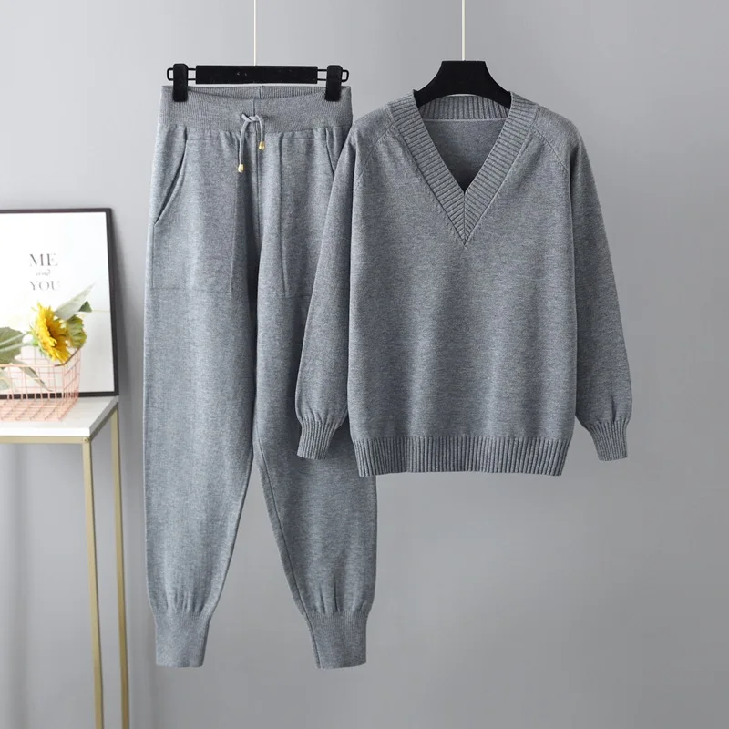 Blubelle Casual Solid Color Woven Knitted 2-Piece Set 2025 Winter Women's V-Neck Sweater + Relaxed Fit Full Length Cuffed Pants