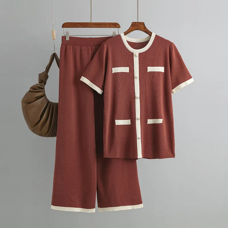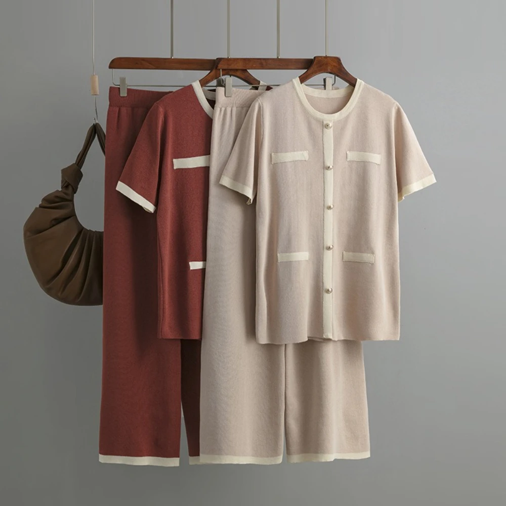 Blubelle Cross-Border Summer Casual Washable Color-Block Patchwork Knit Two-Piece Set Women-Button-Detailed Short Sleeve Top +