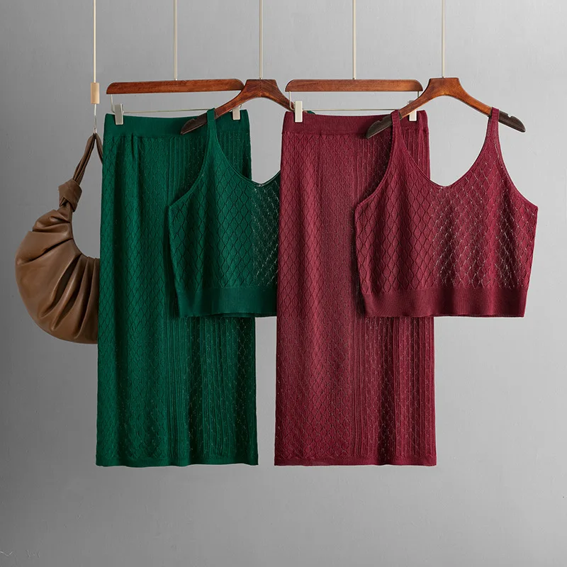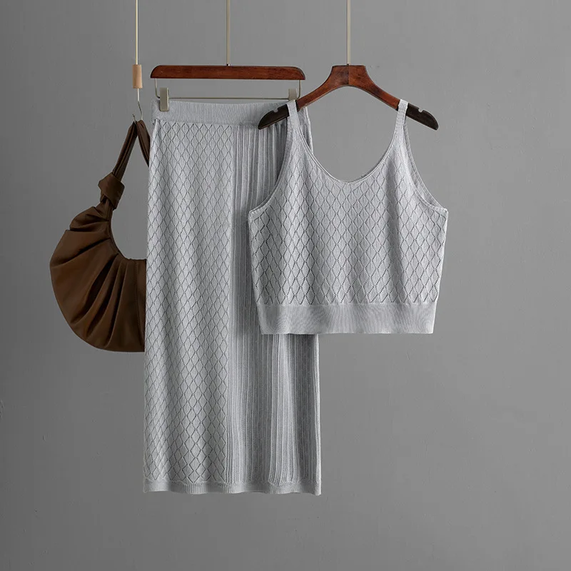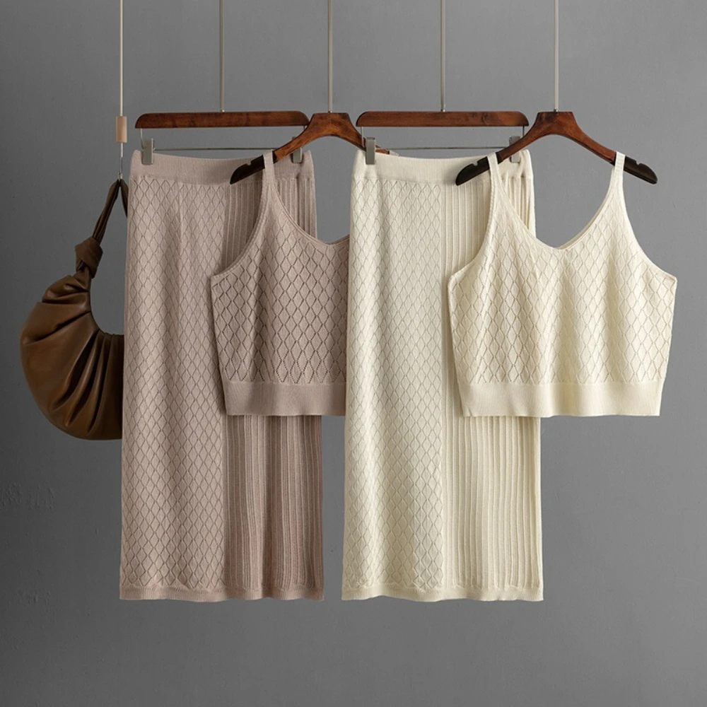 Blubelle Cross-Border Summer Casual Woven Openwork Knit Two-Piece Set for Women-Loose Fit Camisole + Ankle-Length Midi Skirt