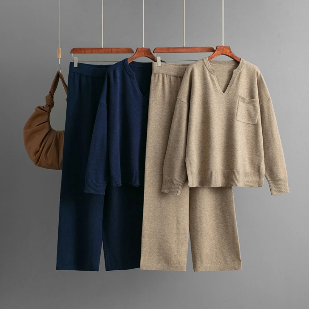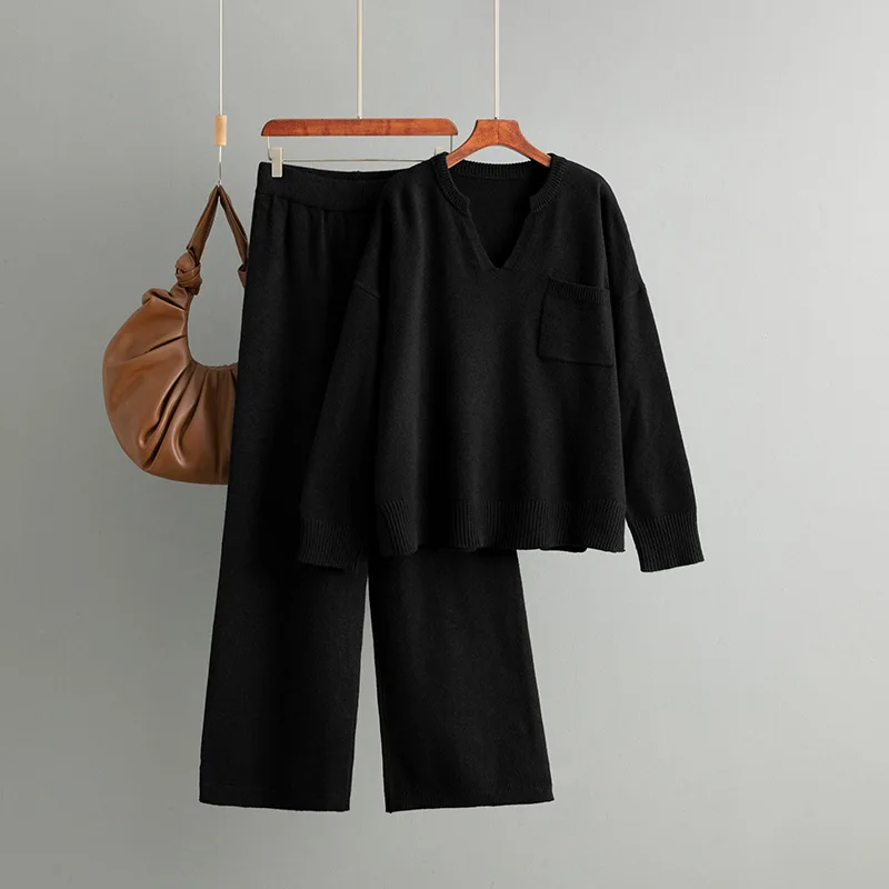 Blubelle Winter Casual Solid Cross-border Euro-American V-Neck Knit Set Women-Pocketed Split Sweater + Wide-Leg Pants 2-Piece