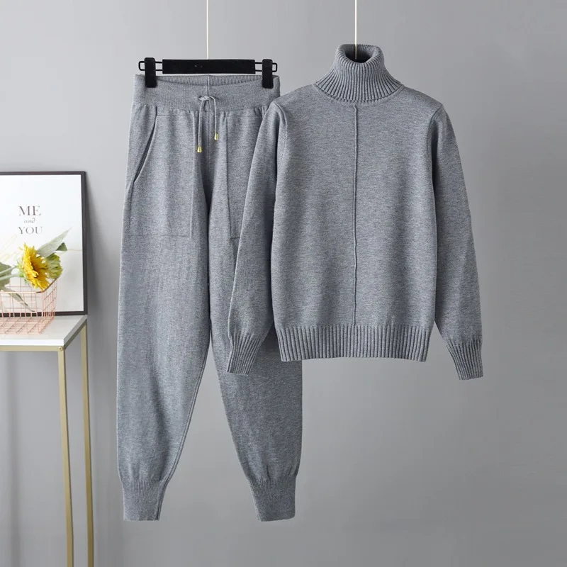 Blubelle 2025 Winter New Women's Casual Loose Solid Color Knitted 2-Piece Set Turtleneck Sweater + Cuffed Sweatpants Washable