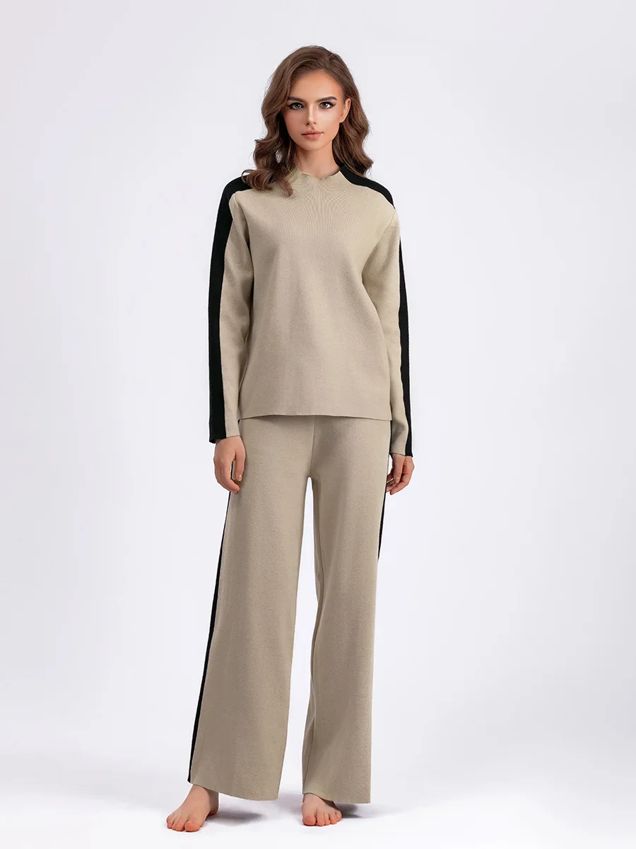 Blubelle Cross-Border Euro-American Women's Winter Turtleneck Casual Knit Relaxed Fit Set-Color Block Patchwork Ankle-Length