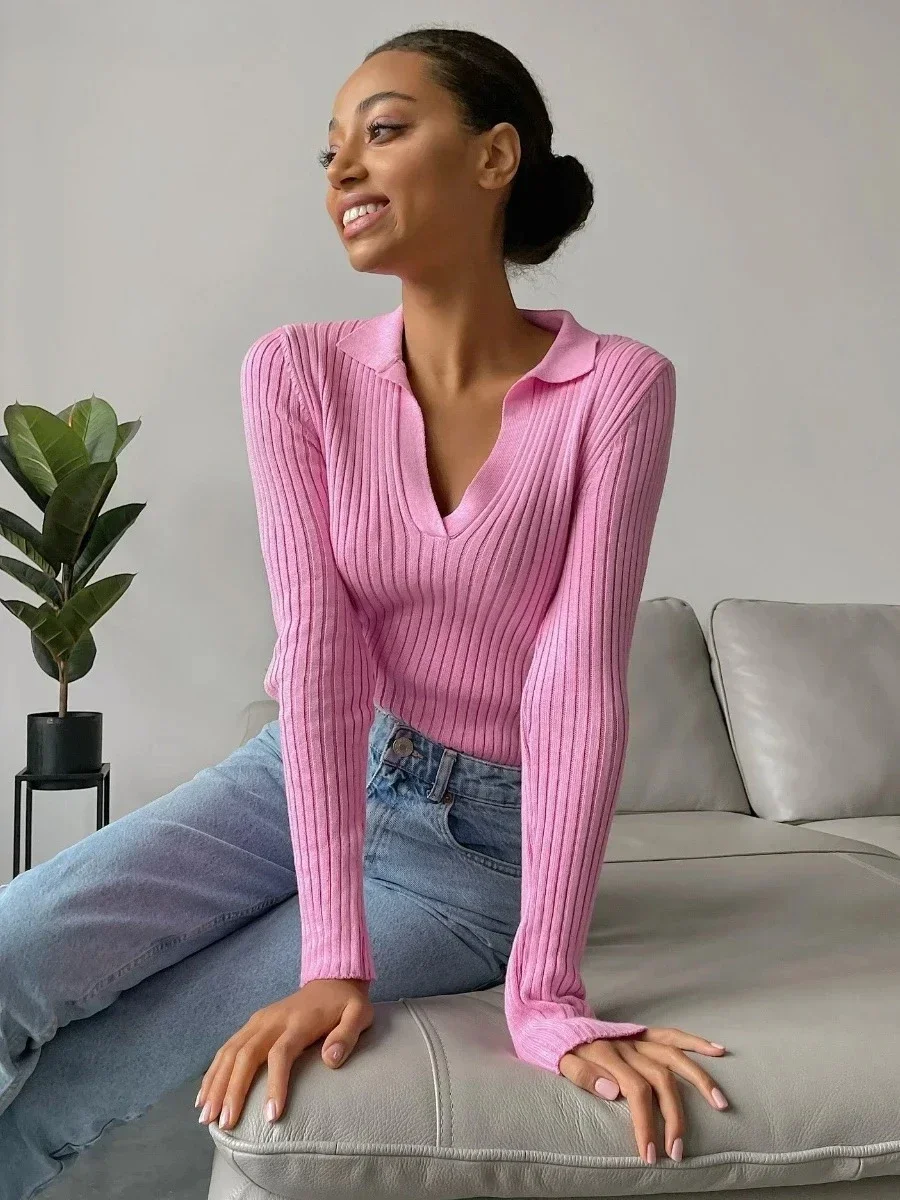 Blubelle Women's Basic Tops Autumn Winter Slim Fit Pullover Soft Warm Knitted Turn-down Collar Patchwork Fashion Casual Midi