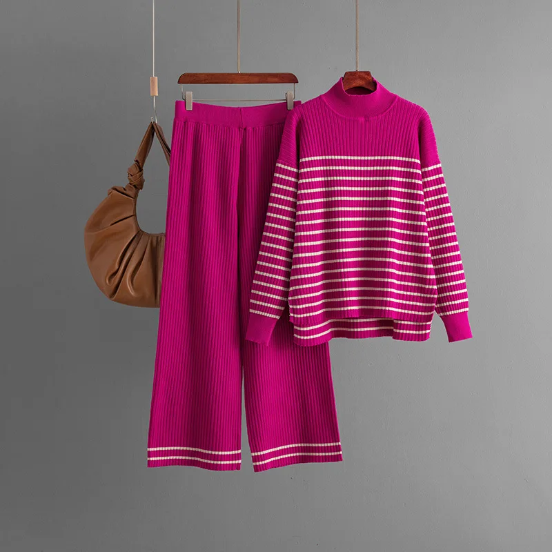 Blubelle Winter Women's Striped Turtleneck Relaxed Fit Casual Woven Knit Full-Length Set-Split Hem Sweater + Wide Leg