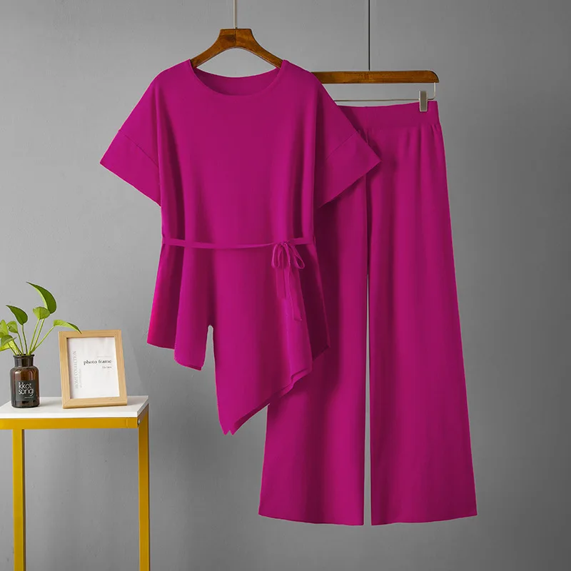 Blubelle Cross-Border Casual Solid Asymmetric Knit Two-Piece Set Women-Drawstring Short Sleeve Top + Wide-Leg Pants (Summer)