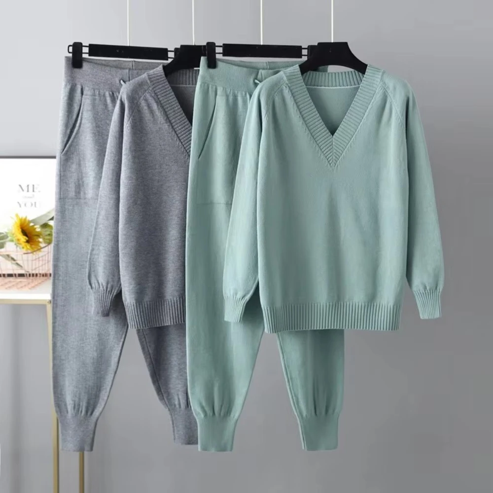 Blubelle Cross-border European American Winter Casual Women's Knit Set V-neck Sweater + Relaxed Fit Cuffed Pants Two-piece Set