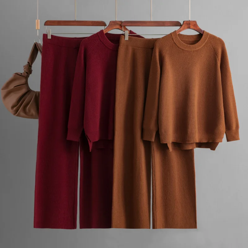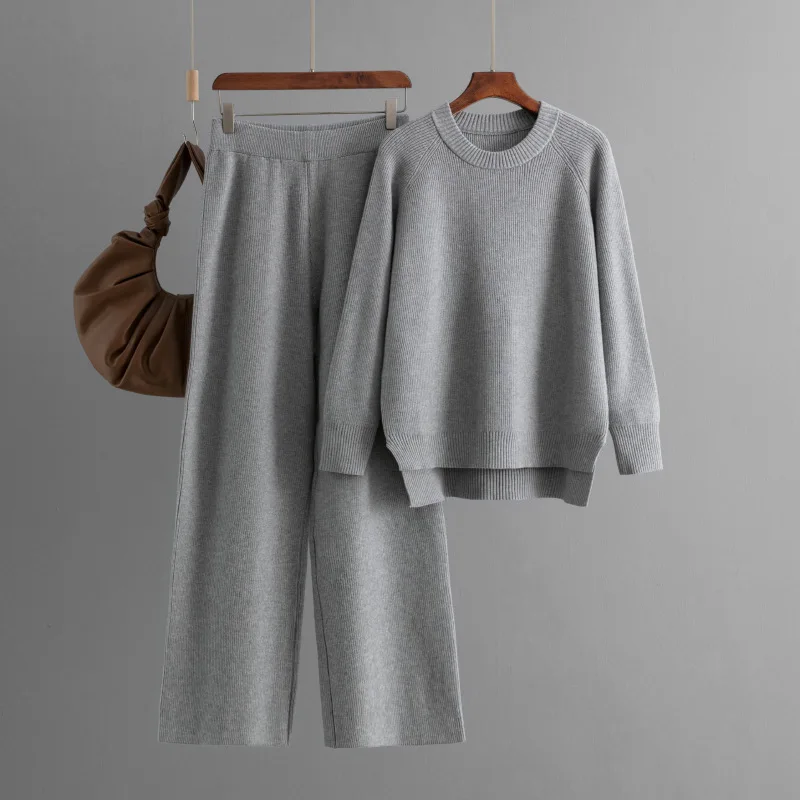 Blubelle Cross-border Euro-American Winter Casual Solid Crew Neck Woven Knit Set Women-Split Sweater + Wide-Leg Pants 2-Piece
