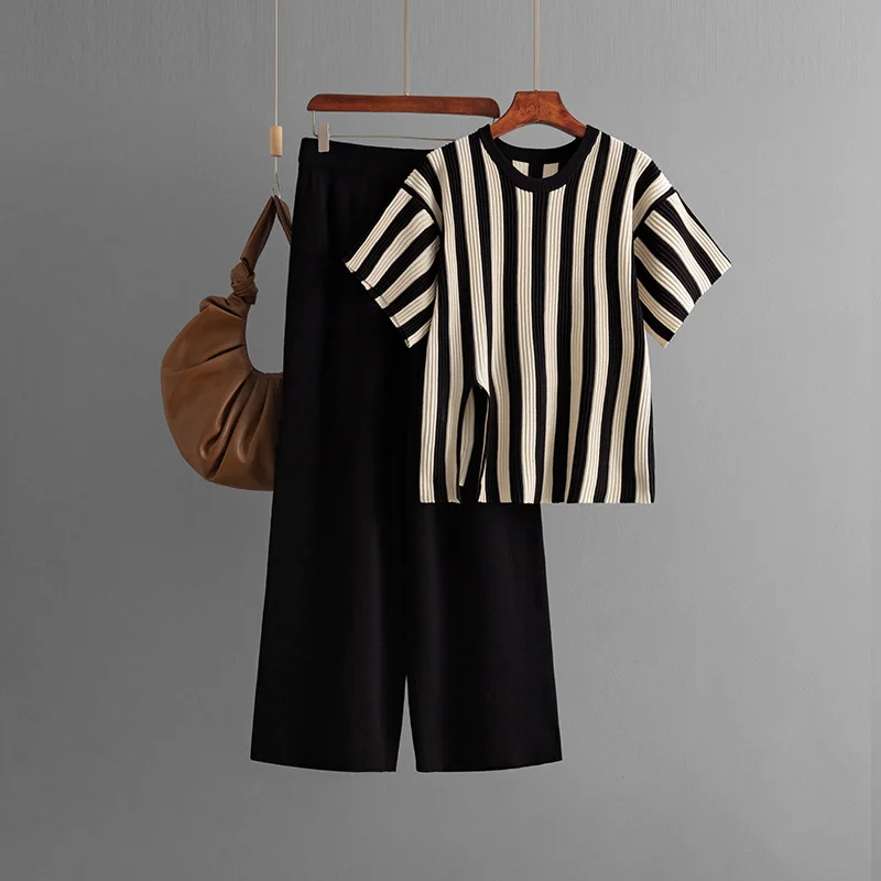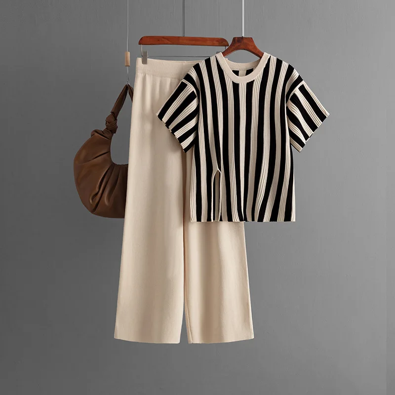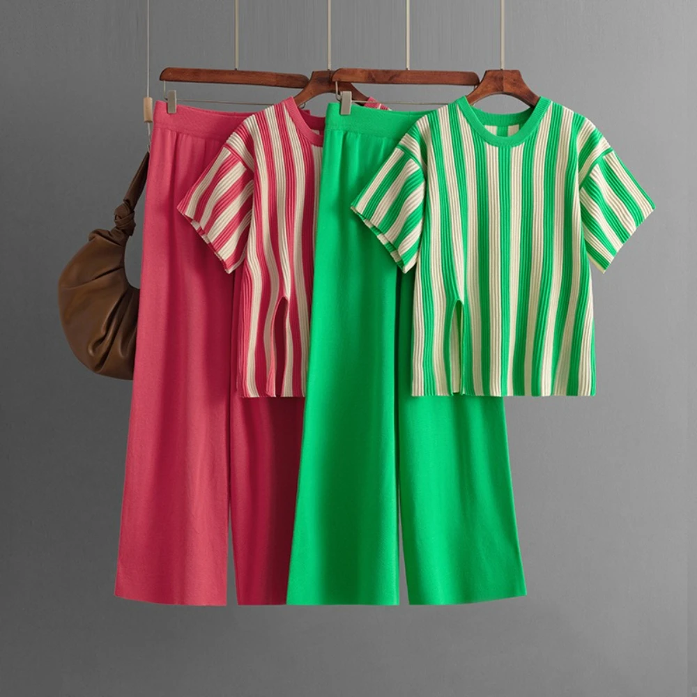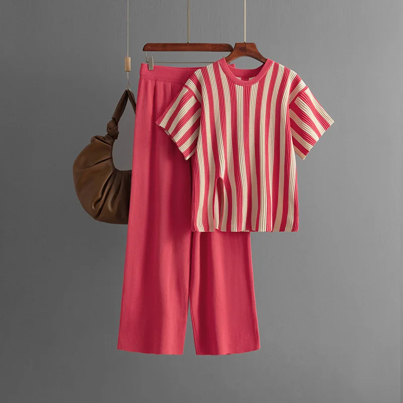 Blubelle Casual Summer Color-Block Woven Knit Two-Piece Set for Women-Short Sleeve Top + Wide-Leg Pants