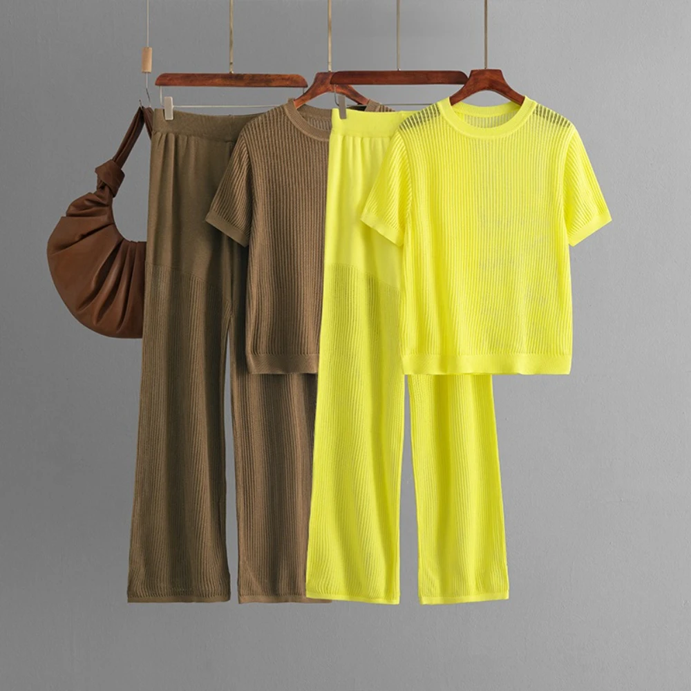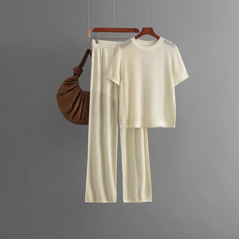 Blubelle Solid Woven Openwork Knitted Casual 2-Piece Set Women's Crew Neck Short Sleeve Top + Wide-Leg Pants Summer