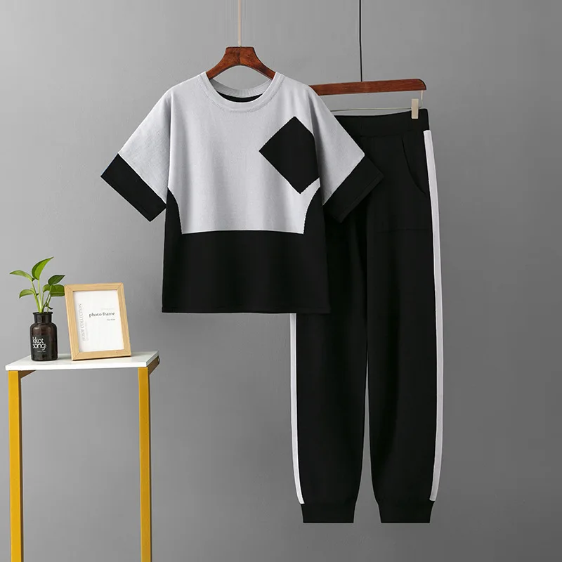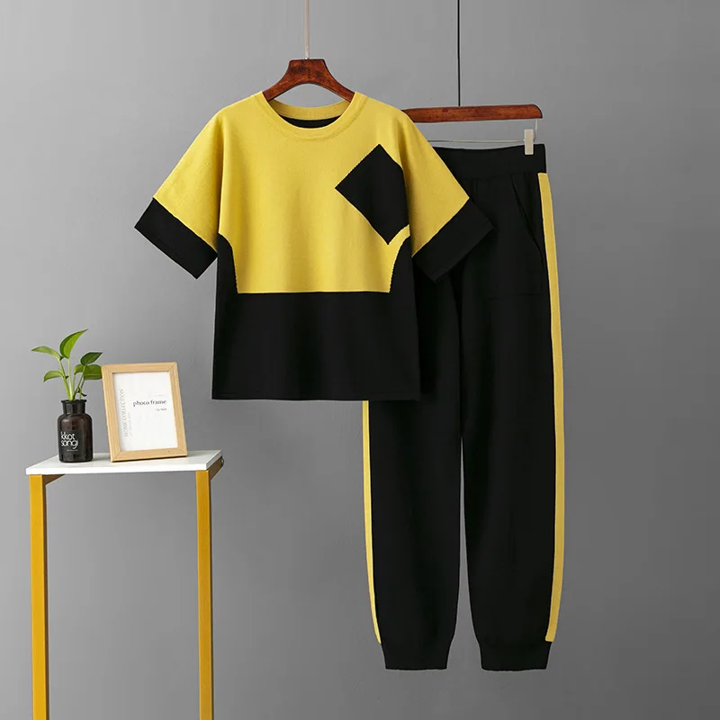 Blubelle Cross-Border Summer Casual Patchwork Color-Block Knit Two-Piece Set Women-Crew Neck Short Sleeve Top + Cuffed Pants