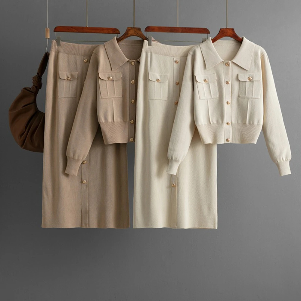 Blubelle 2025 Winter New Women's Casual Solid Knitted 2-Piece Set Loose Fit Collared Sweater + Ankle-Length Button Midi Skirt