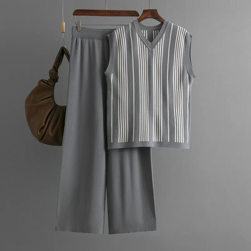 Blubelle Striped Knitted 2-Piece Set Women's Casual V-Neck Tank Top + Relaxed Fit Wide-Leg Pants