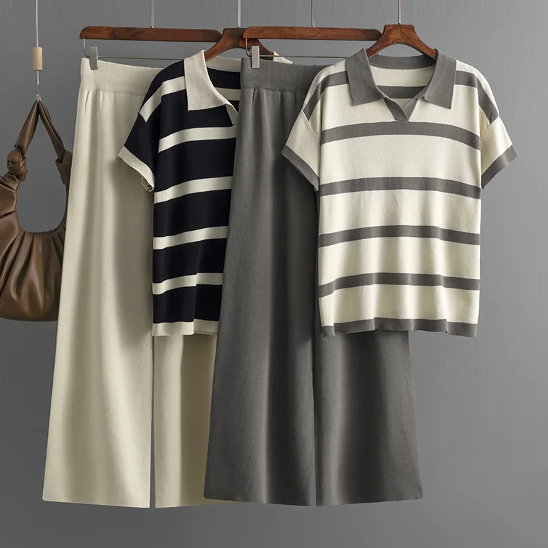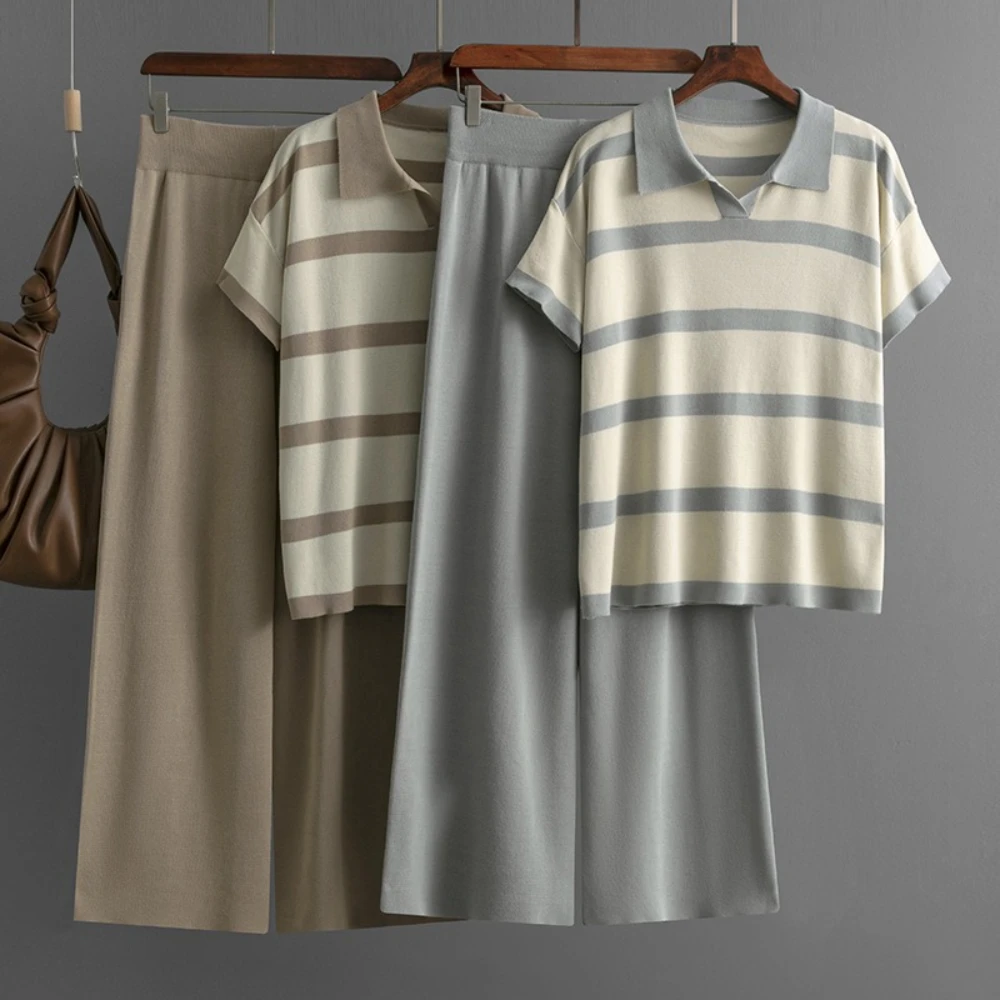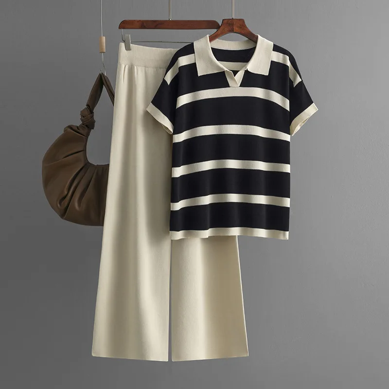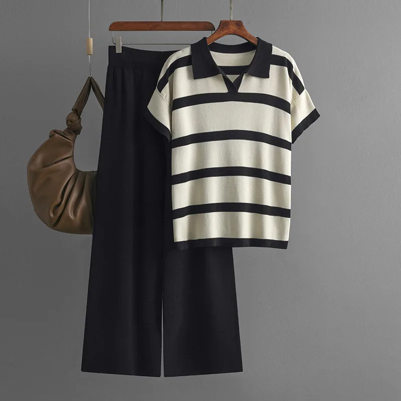 Blubelle Cross-Border Casual Striped Patchwork Knit Two-Piece Set for Women-Polo Collar Short Sleeve Top + Wide-Leg Pants