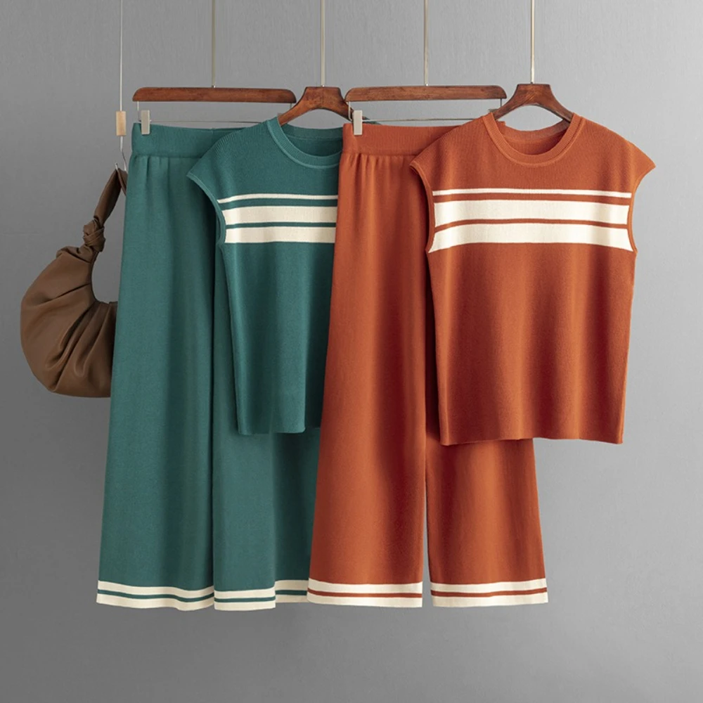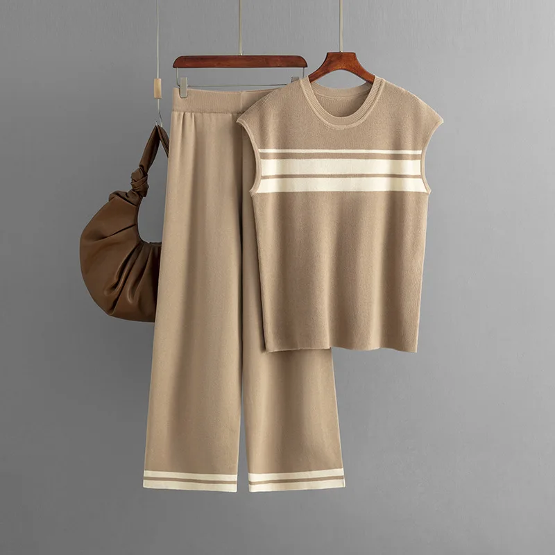 Blubelle Cross-Border Striped Knit Casual Washable Two-Piece Set for Women-Sleeveless Tank Top + Loose-Fit Pants