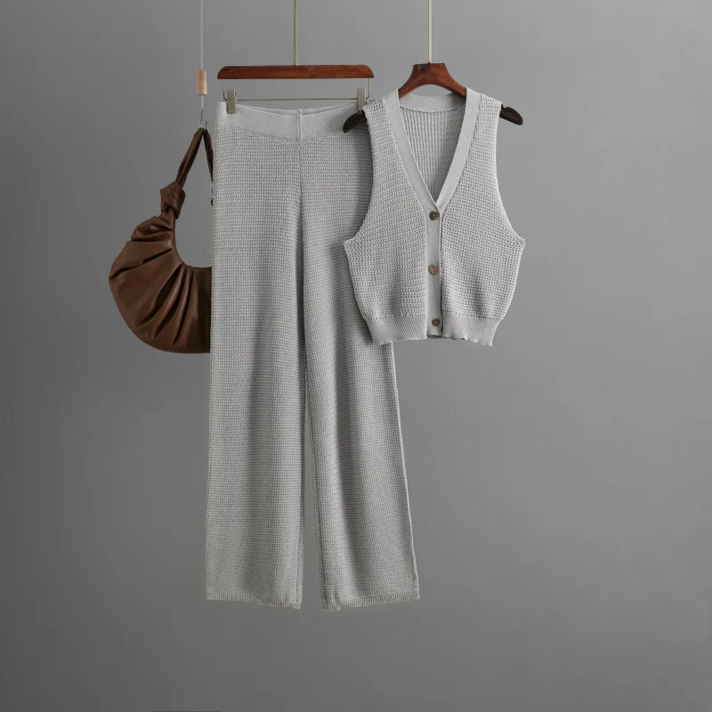 Blubelle Cross-Border Solid Casual Openwork Knit Two-Piece Set for Women-V-Neck Button Tank Cardigan + Wide-Leg Woven Pants