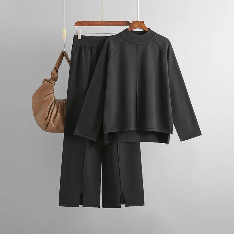 Blubelle Cross-border European American Women's Winter Loose Solid-color Turtleneck Pullover Sweater Slit Knitted Wide-leg Pants
