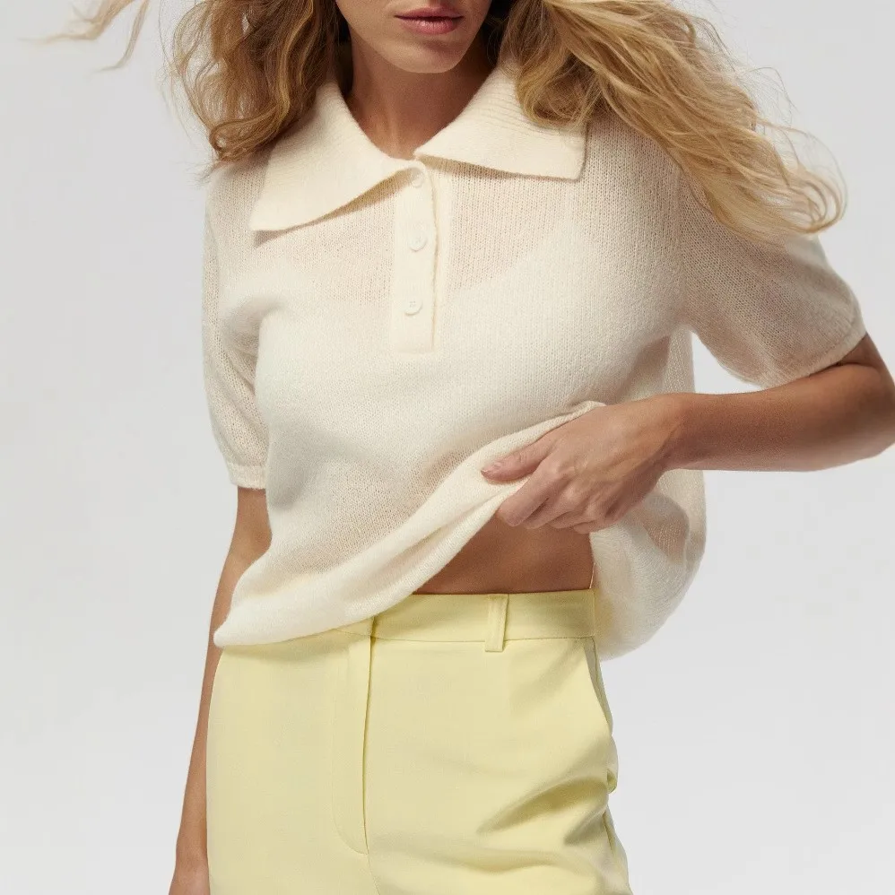 Blubelle Women's Polo Hollow Knitted Short Sleeve Sweater Spring Summer Bubble Sleeve T Shirt Simple Knitted Top