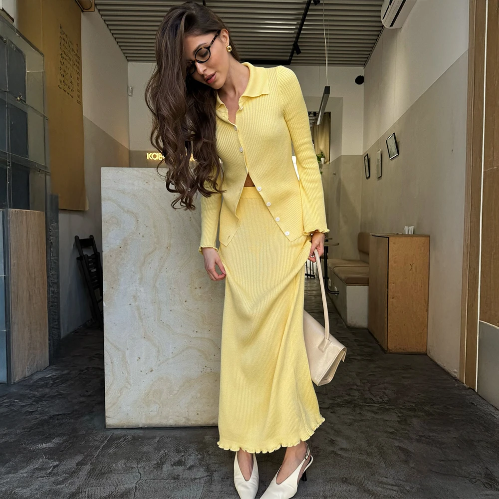 Blubelle Women's Autumn Winter Set New Polo Neck Long Sleeve Ribbed Knit Cardigan Skirt Button Front Elastic Solid Casual Style