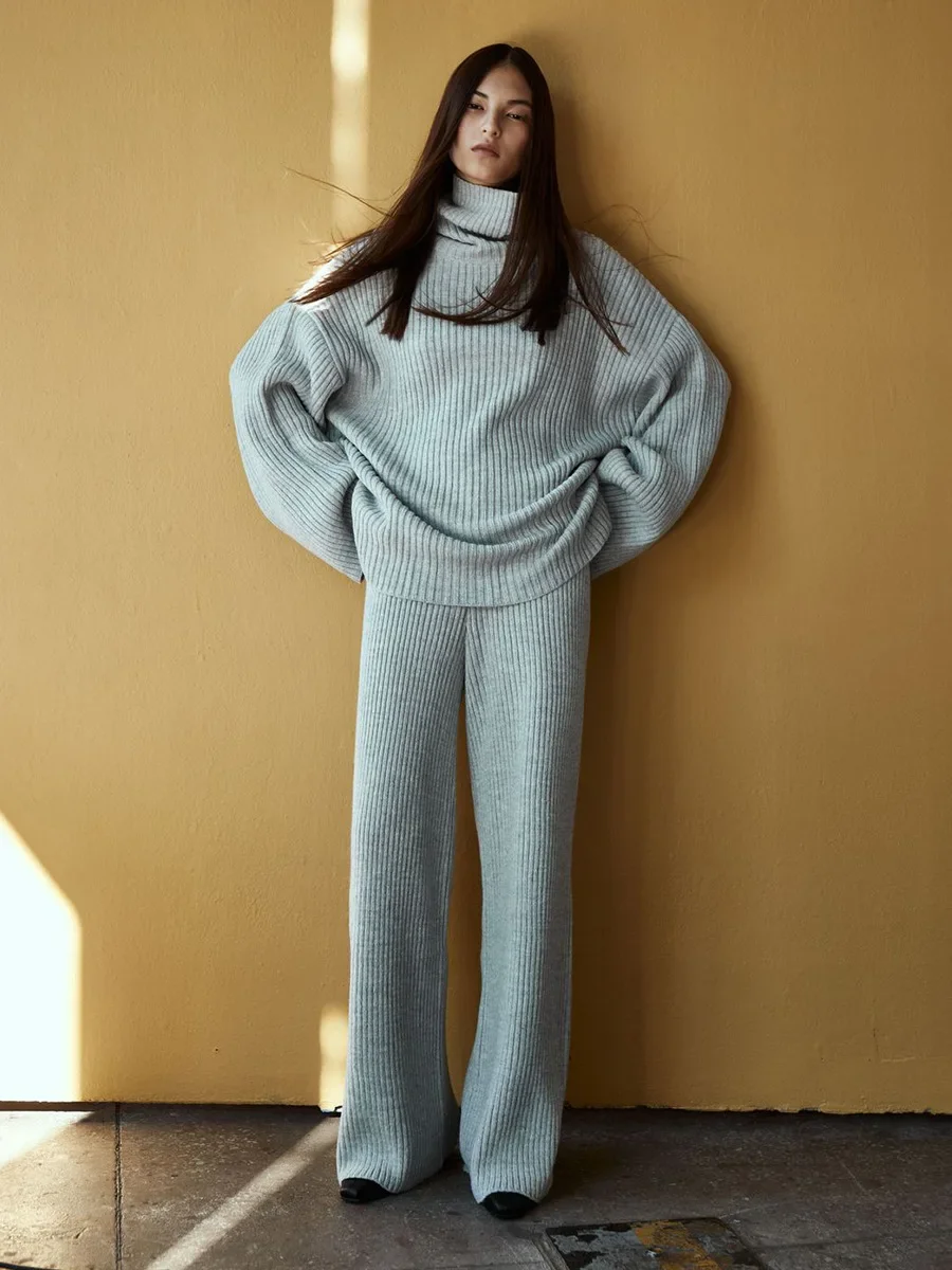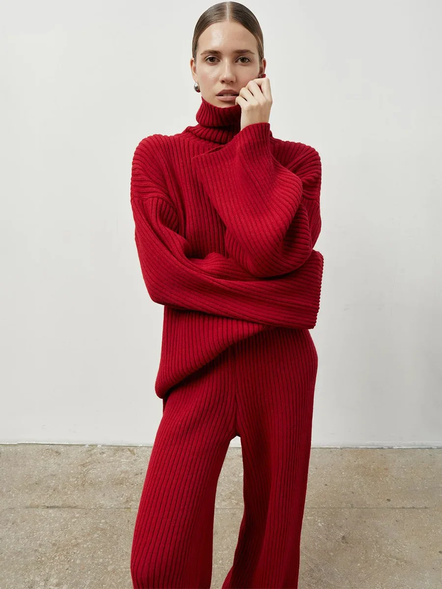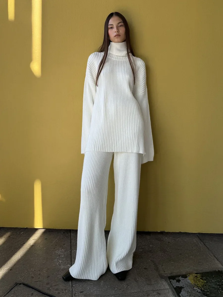 Blubelle New Women's Ribbed Turtleneck Sweater Wide Leg Pants 2-Piece Set Soft Fabric Loose Autumn Winter Pullover Casual Solid