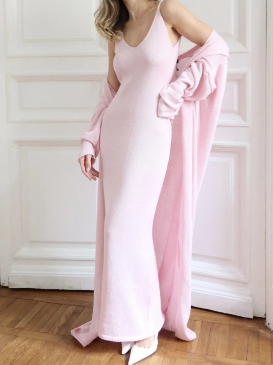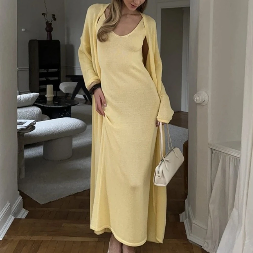 Blubelle Women's Solid Fitted Elegant Casual Long Sleeve Cardigan Set Knitted Hollow Vest Maxi Dress Ankle-Length Winter