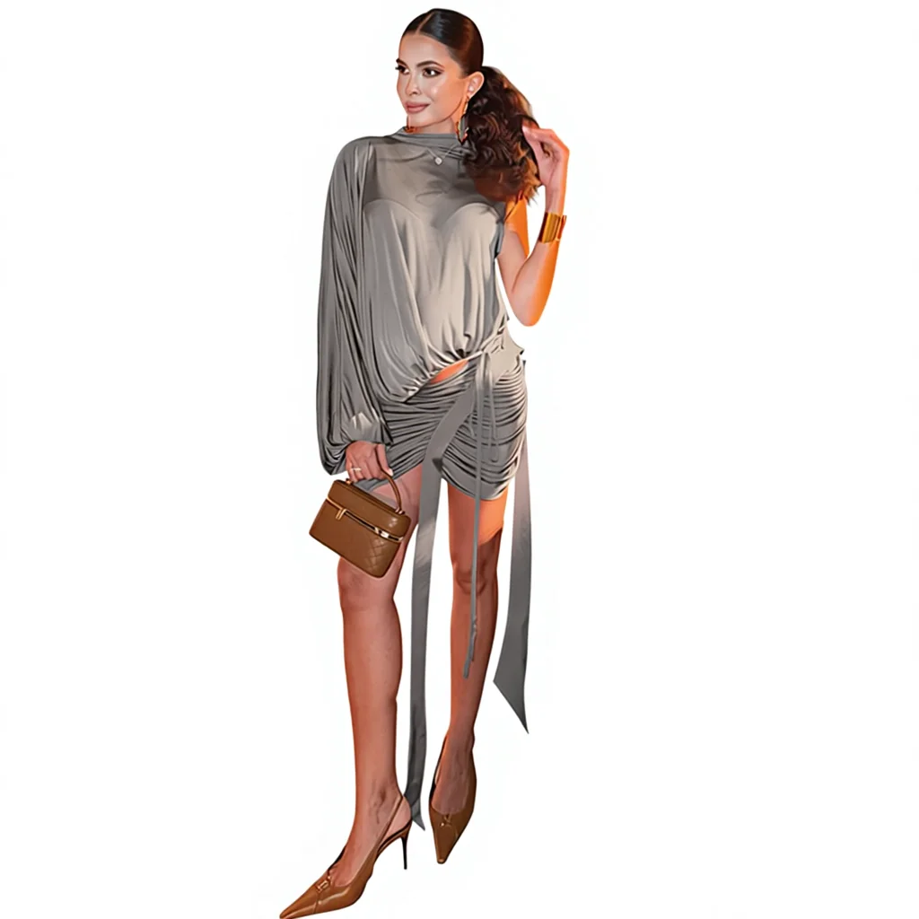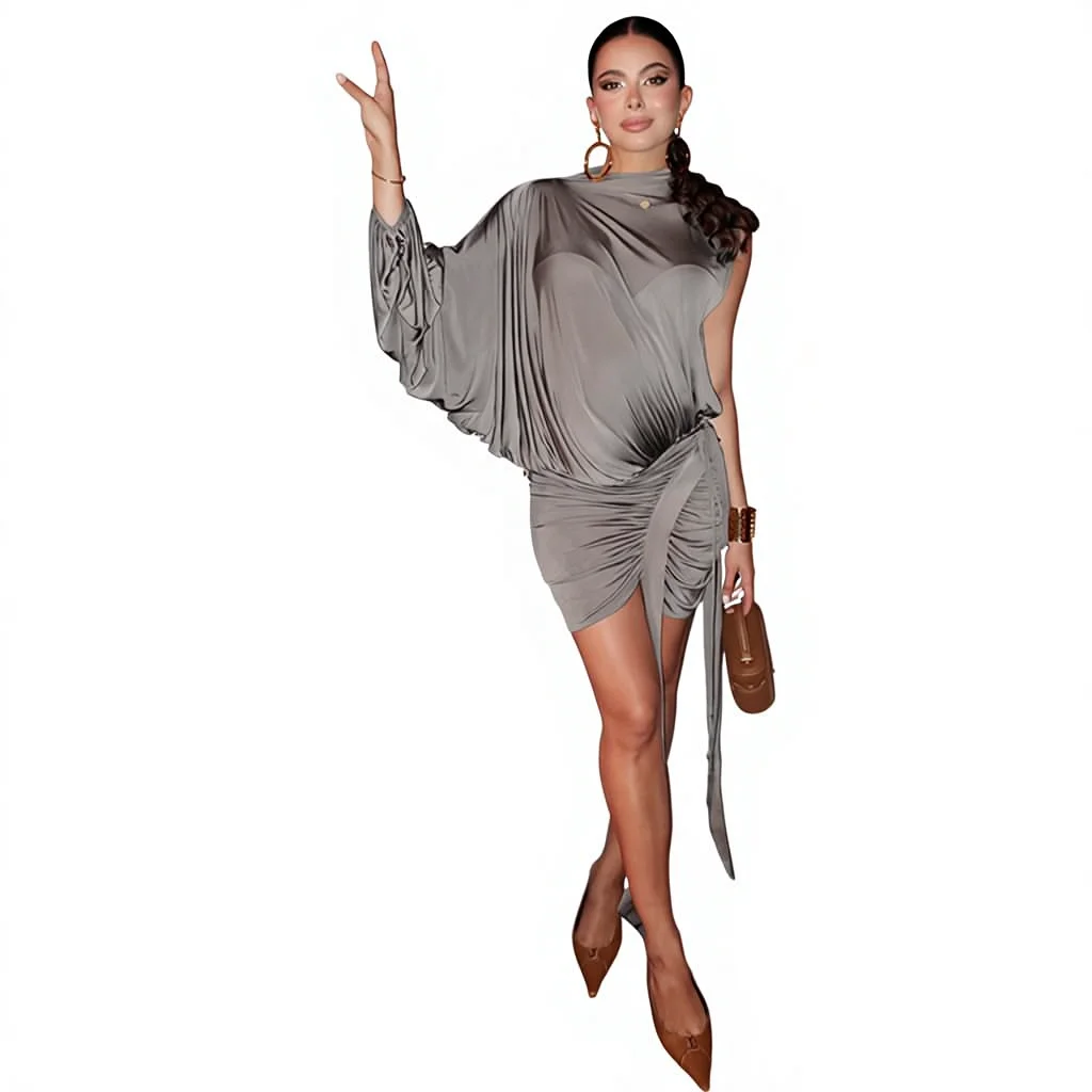 Women's Clothing Style Semi High Neck Single Shoulder Sleeve Top with Hip Fold Irregular Skirt