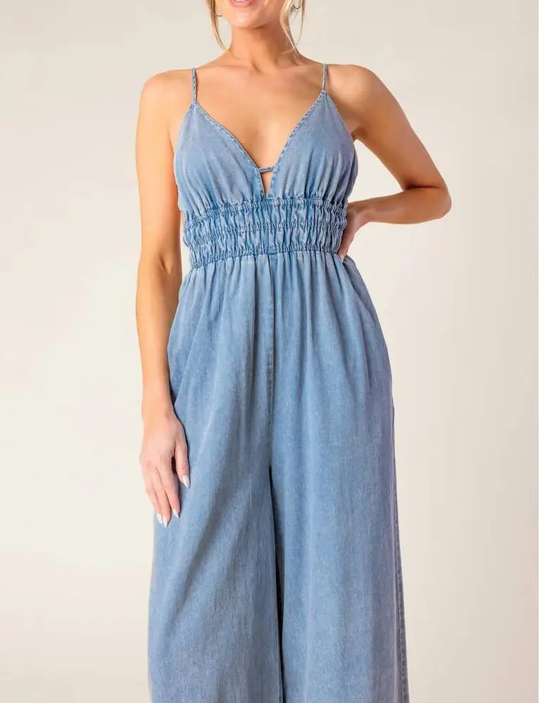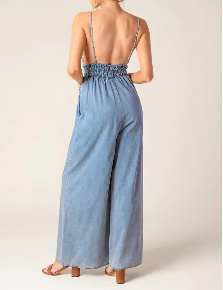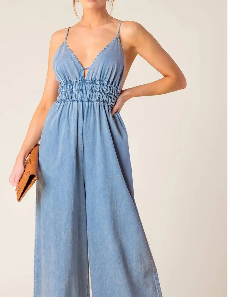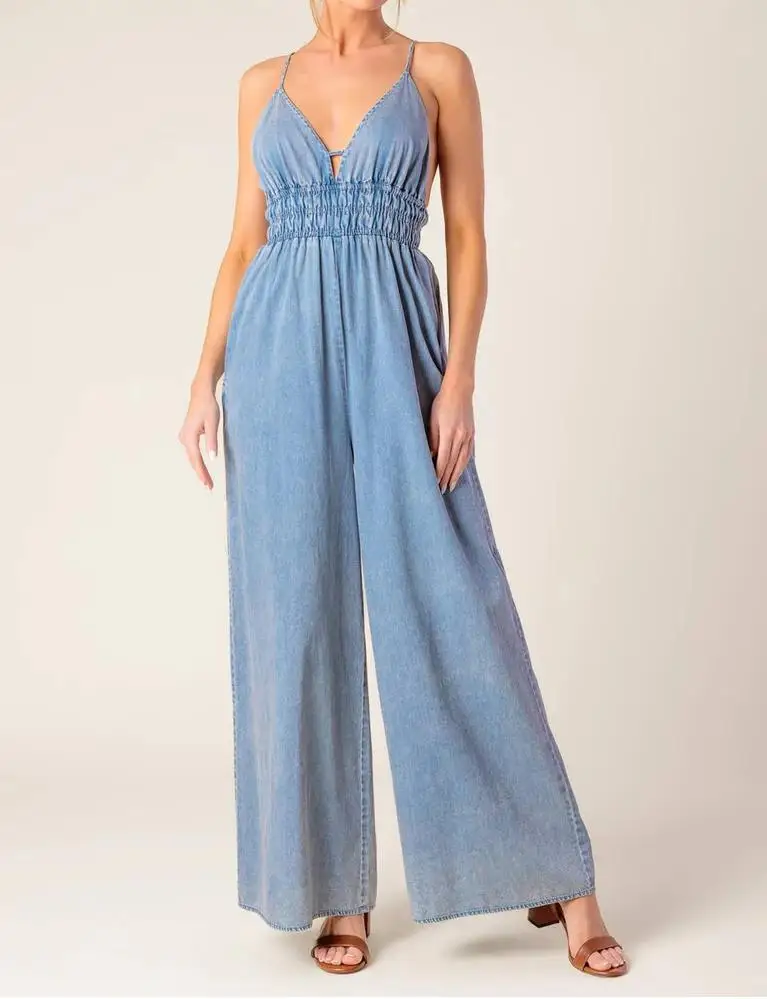 Custom New Arrival Women Jean Jumpsuit Sleeveless Deep V Neck Wide Leg Jean Romper Mineral Washed Denim Jumpsuit