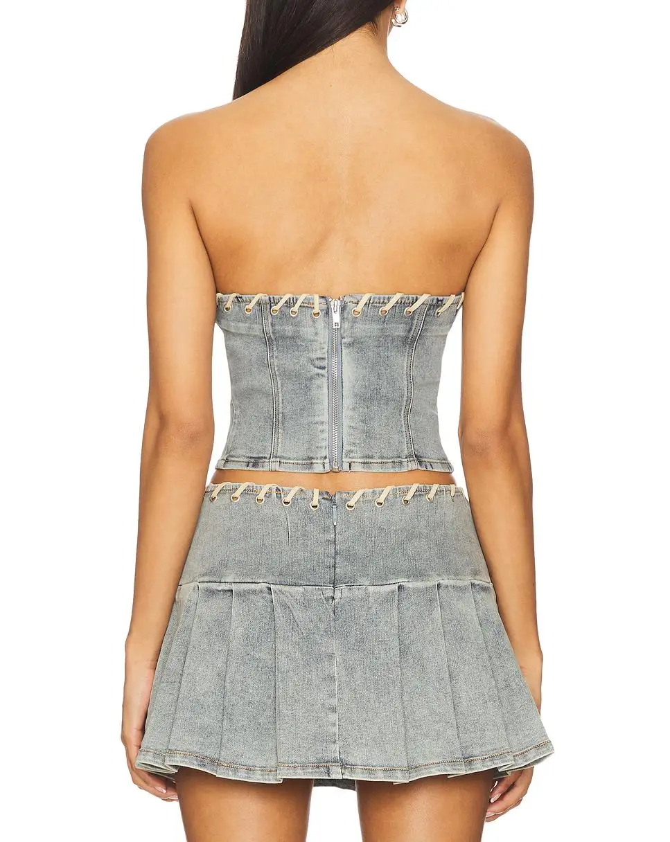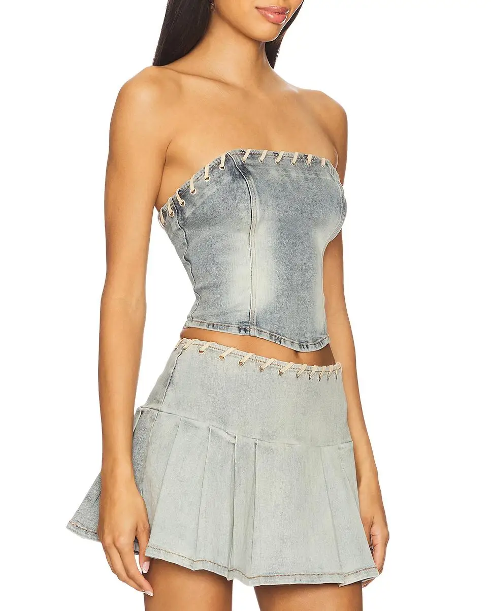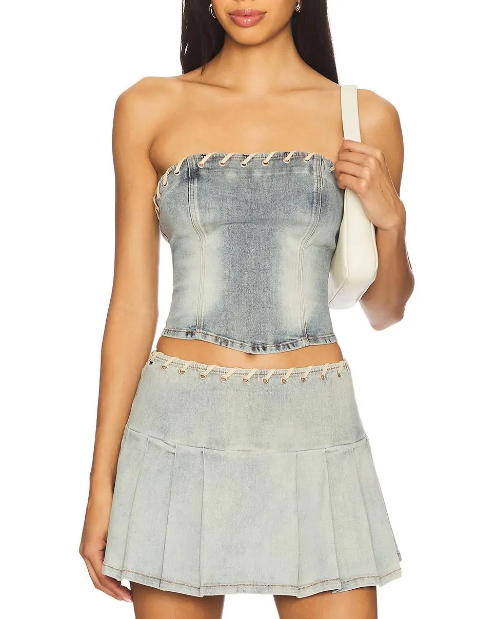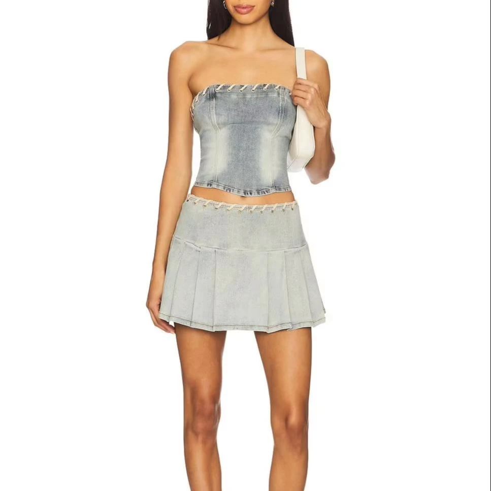 Women's Casual Denim Crop Vest and Pleated Skirt Set Solid Pattern Two-Piece Spring Set