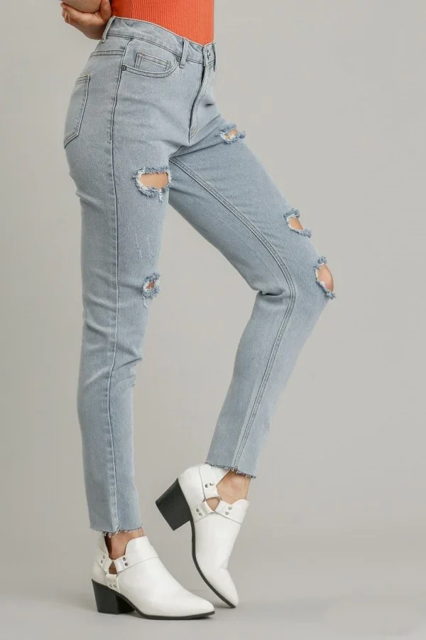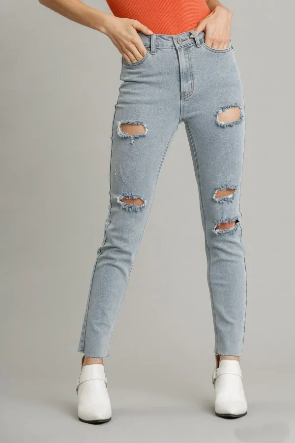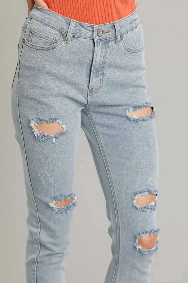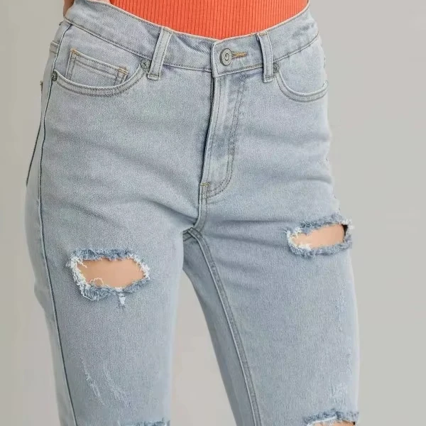Custom Trendy Women Jeans High Stretch Mid Rise Skinny Denim Pants Ripped Mineral Washed Ladies Jean Trousers