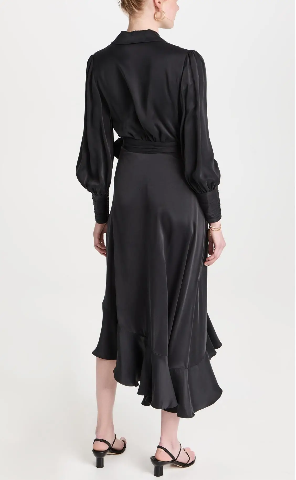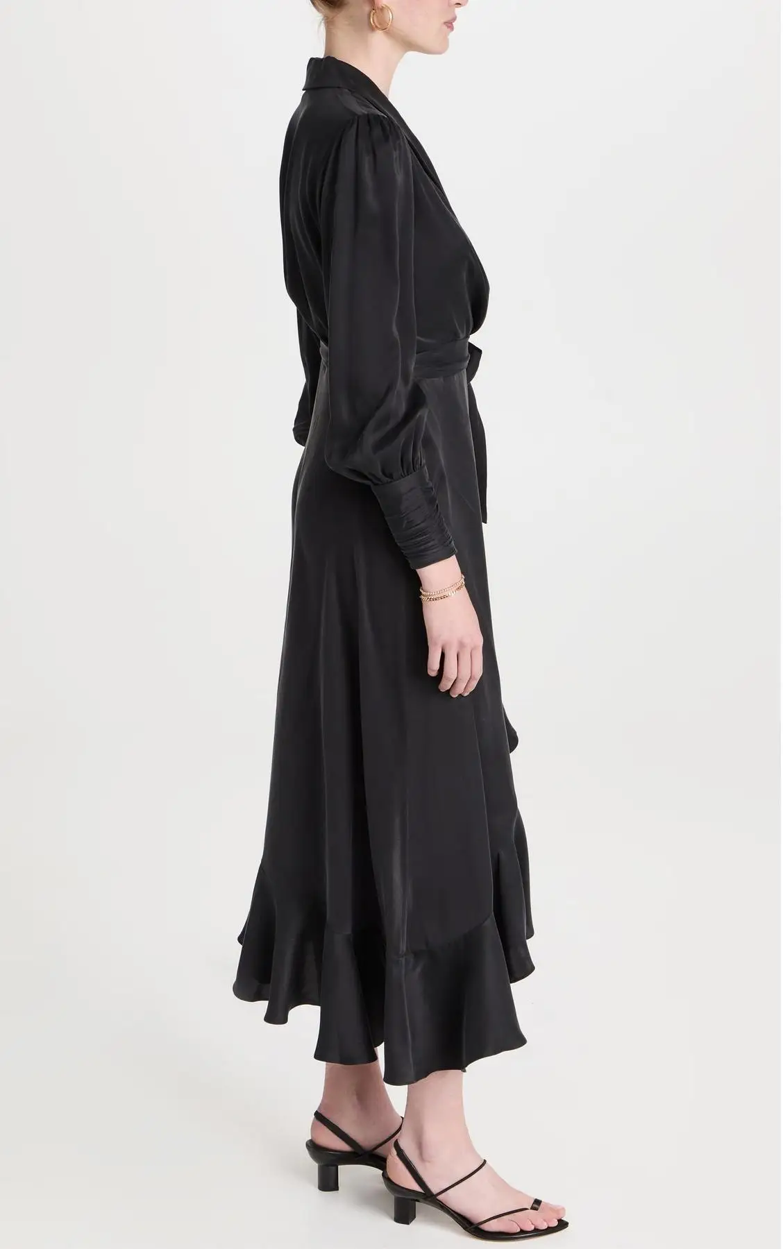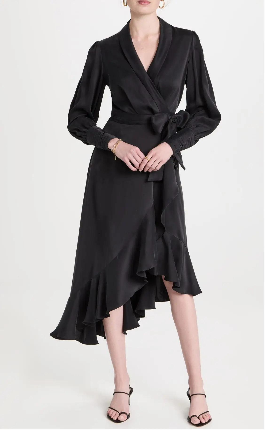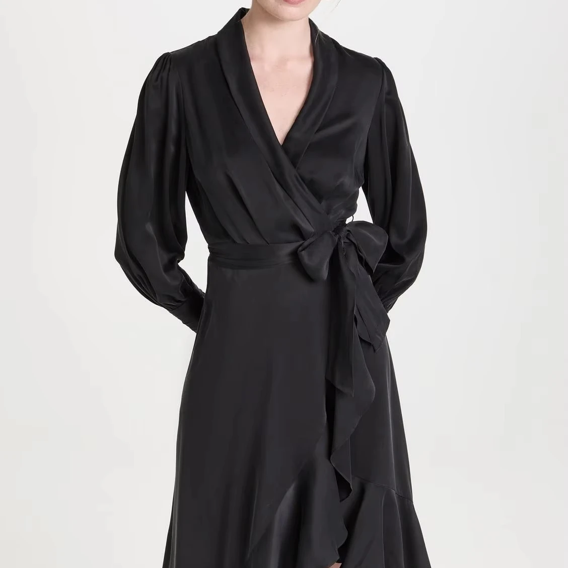 Custom Design Cloth Women's Elegant Formal Dress High Quality Satin Long Sleeves Wrap Tied Ruffle Slit Casual Office Dress Lady