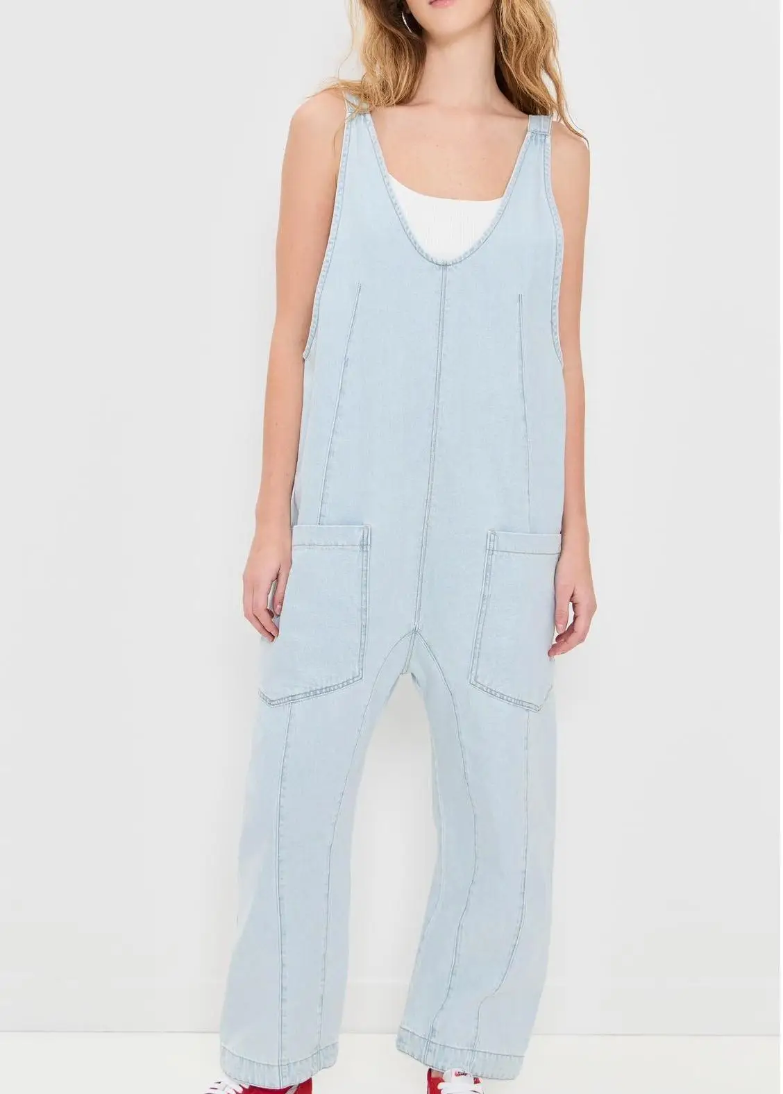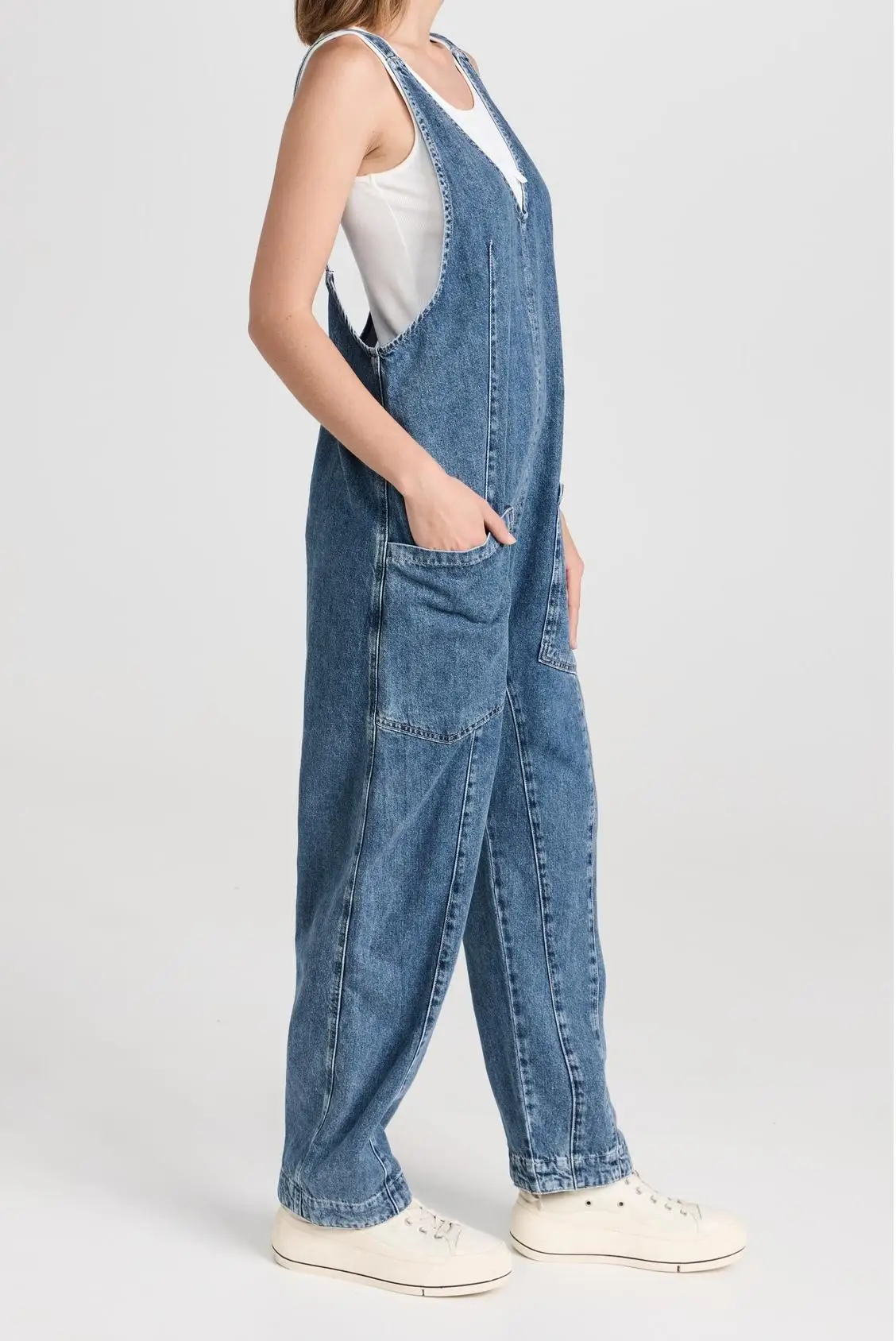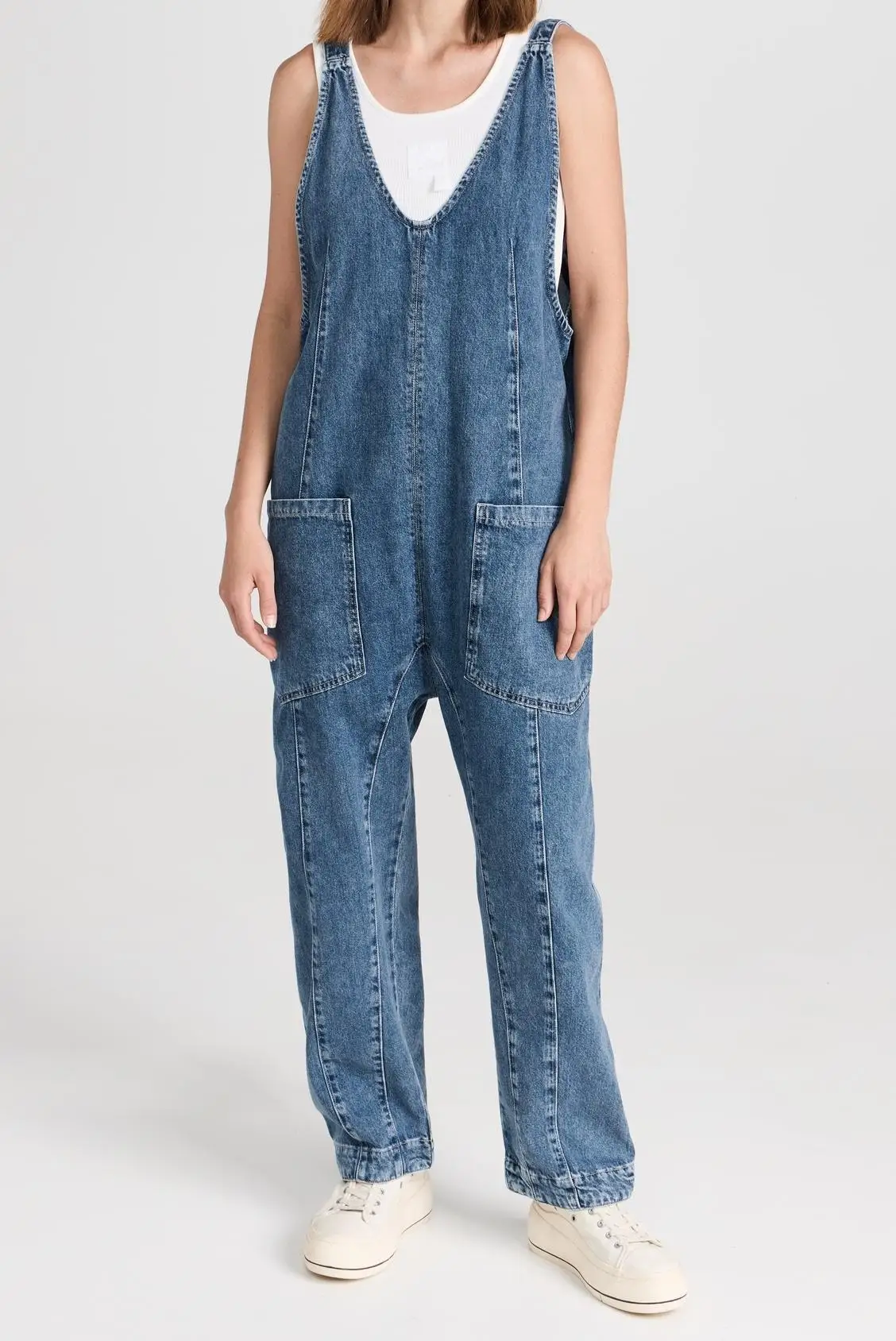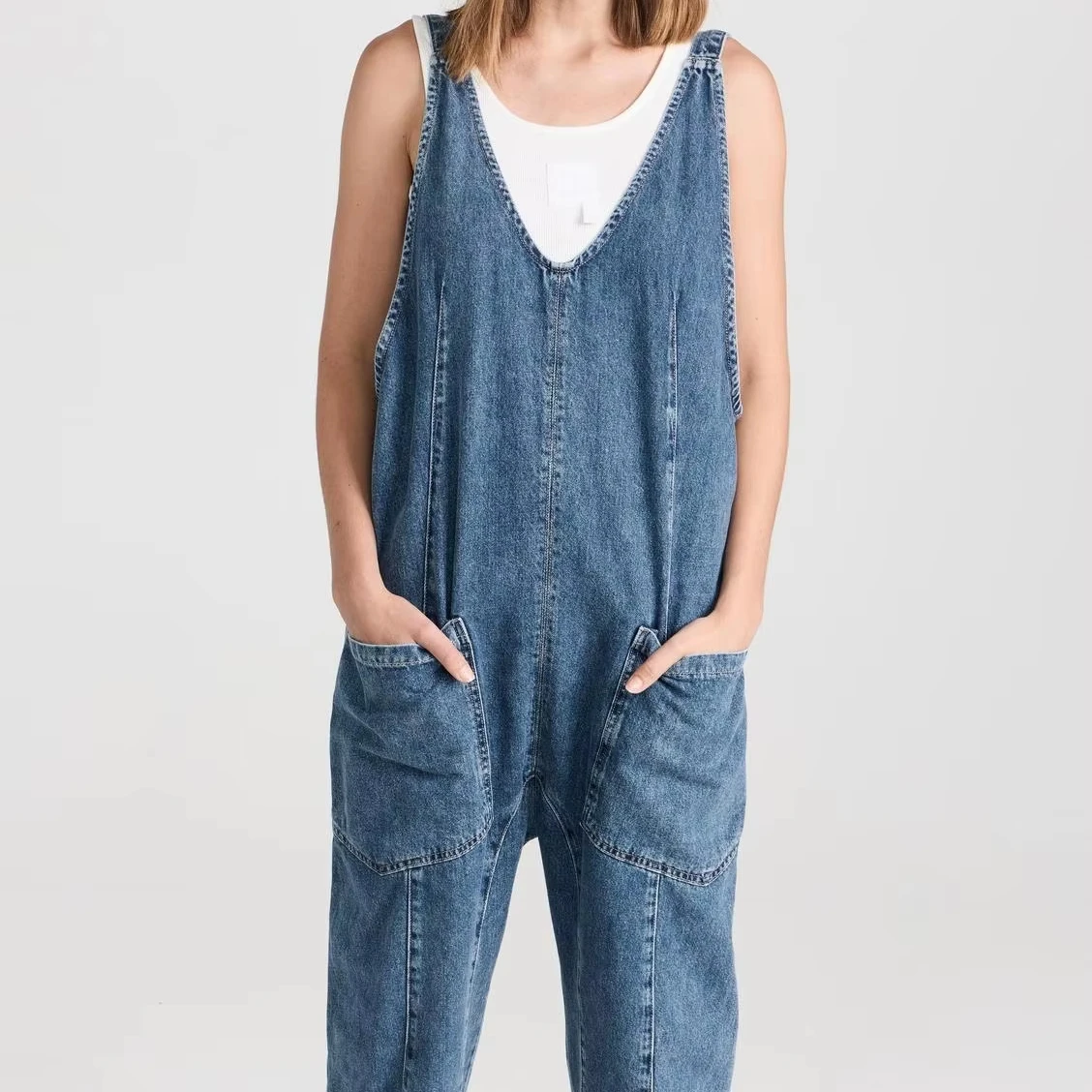 Custom Summer Women's Denim Jumpsuit Long Pants Sleeveless V Neck Mineral Washed Casual Streetwear Jeans Romper Ladies