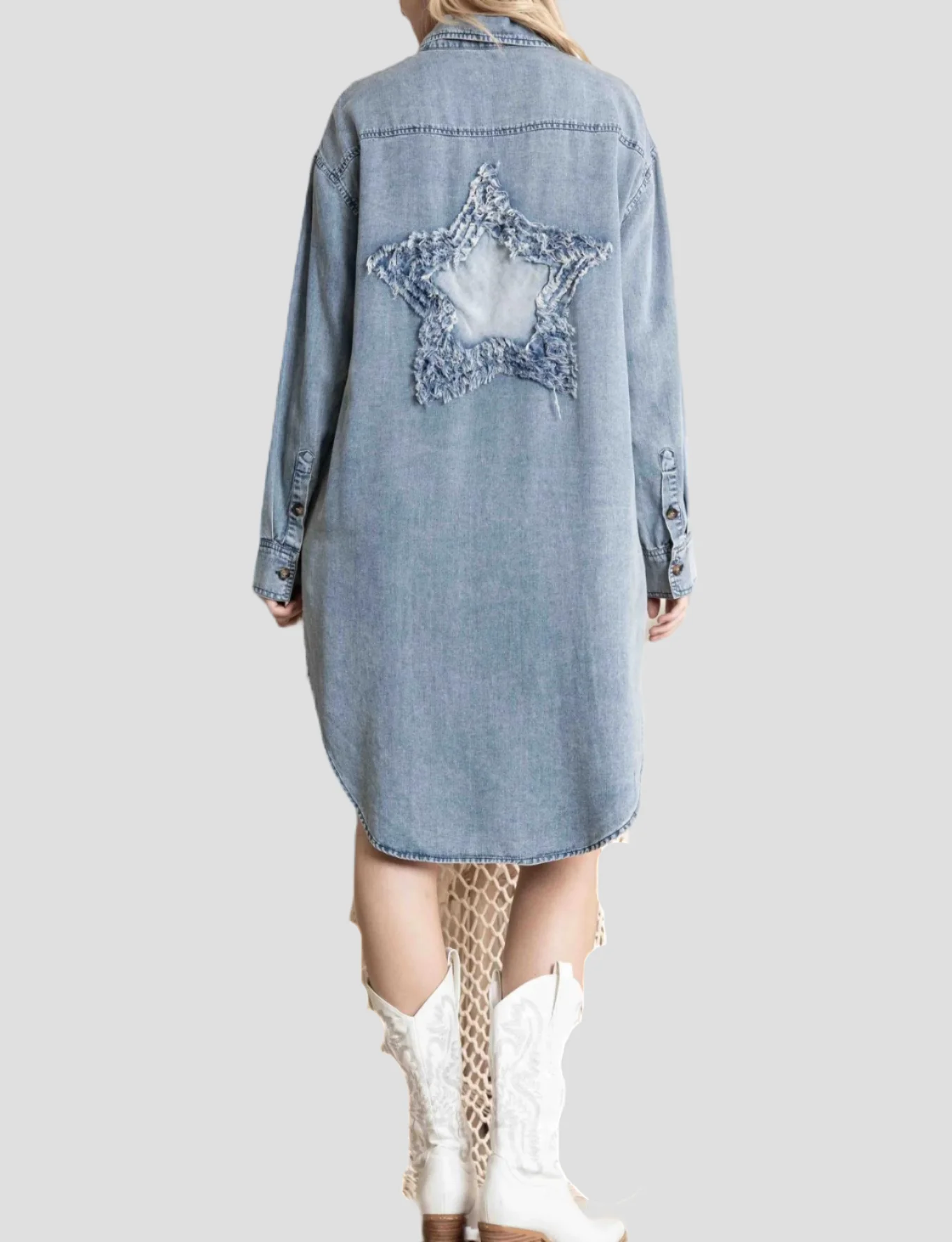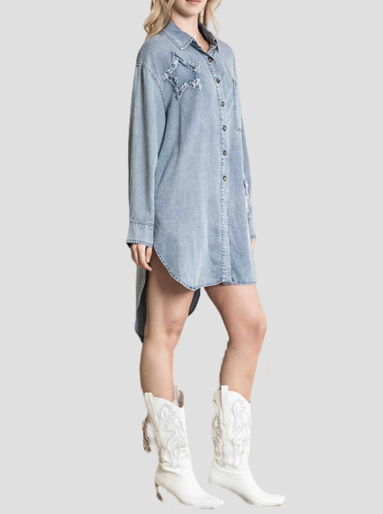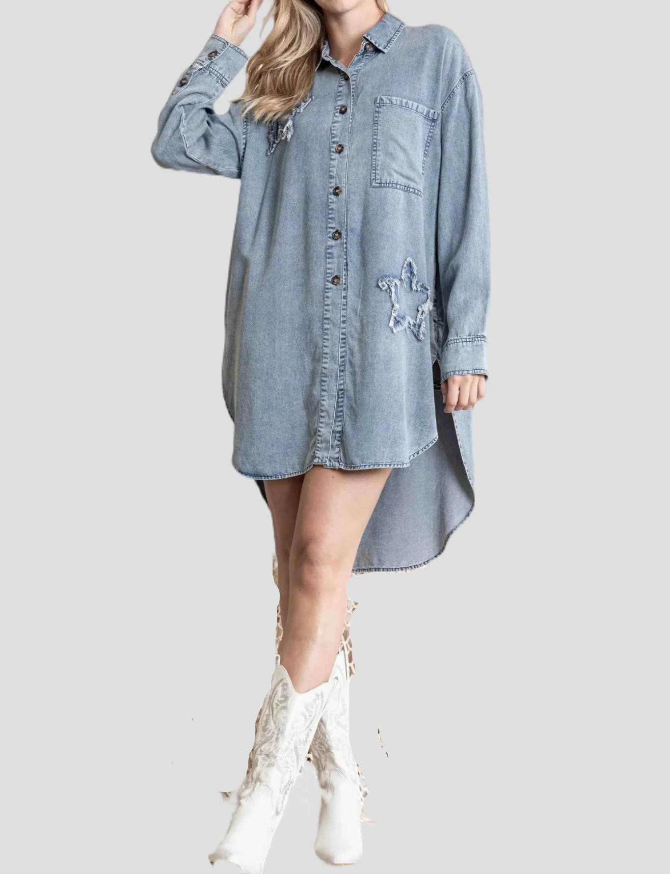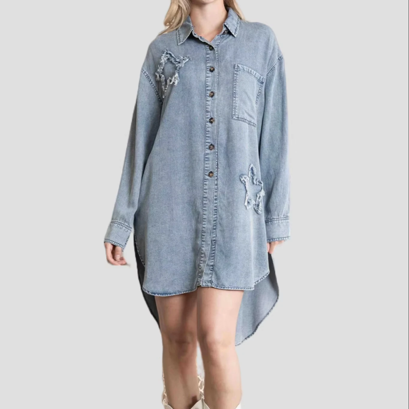 OEM ODM Women's Denim Shirt Dress Hi-Low Hem Star Patch Work Elegant China Manufacturer Custom Casual Jeans Dresses Ladies