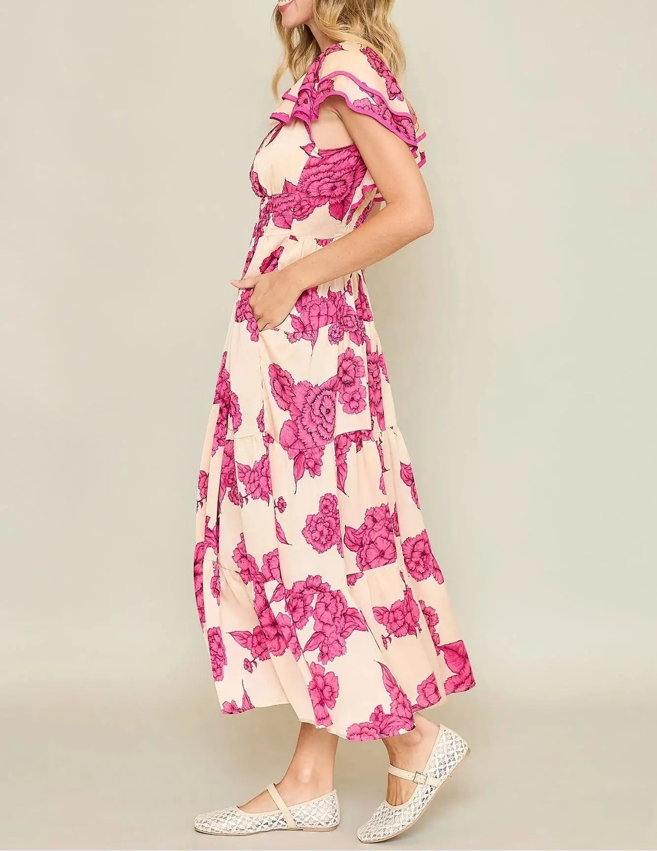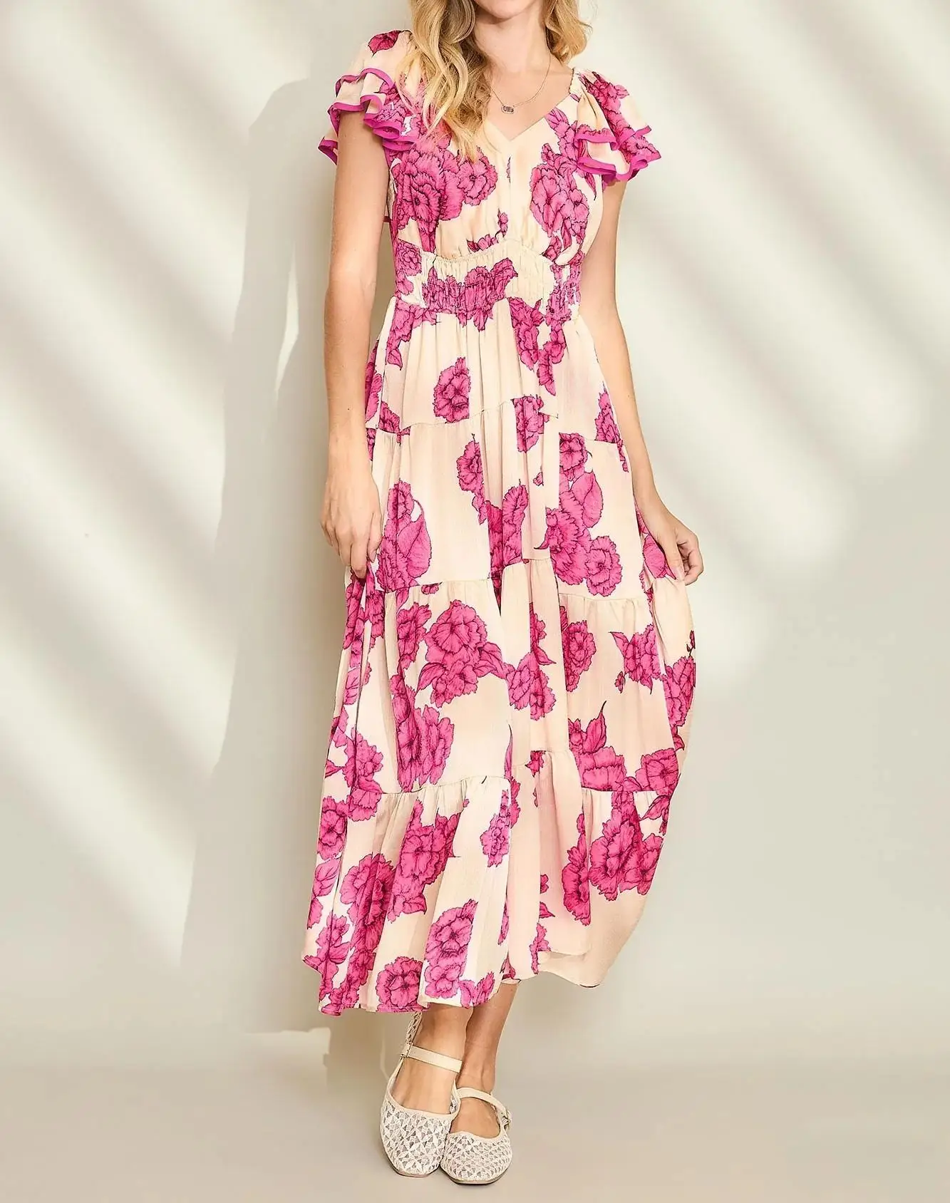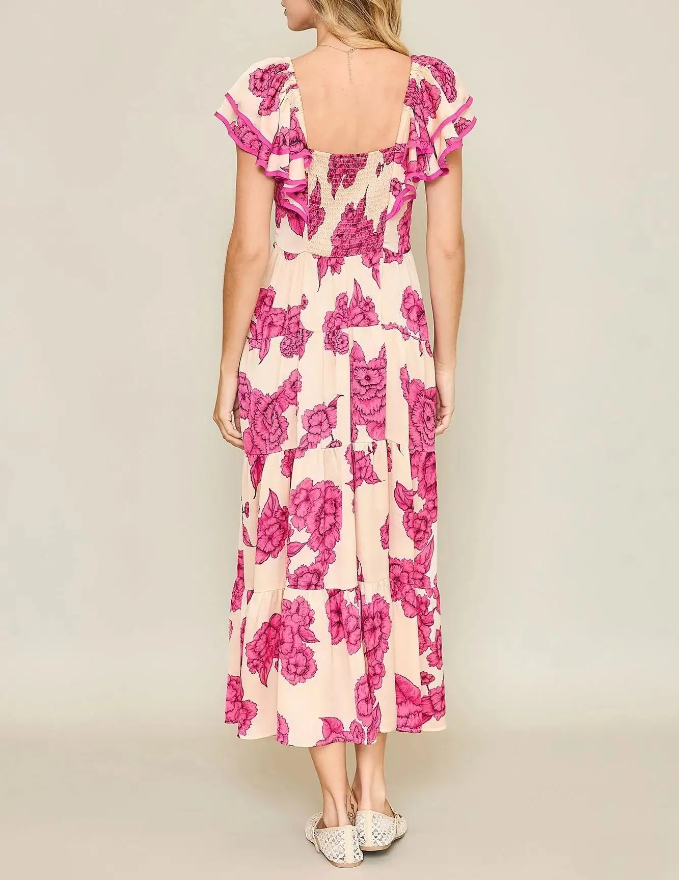 OEM Custom logo Women Dress Bohemian Floral Print Ladies Elegant Prom Clothing Midi Ruffle Shoulder Summer Casual Dress
