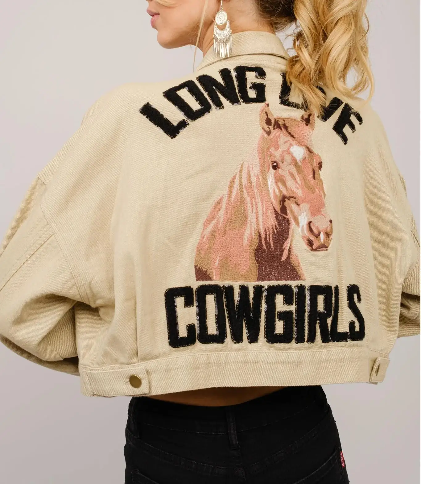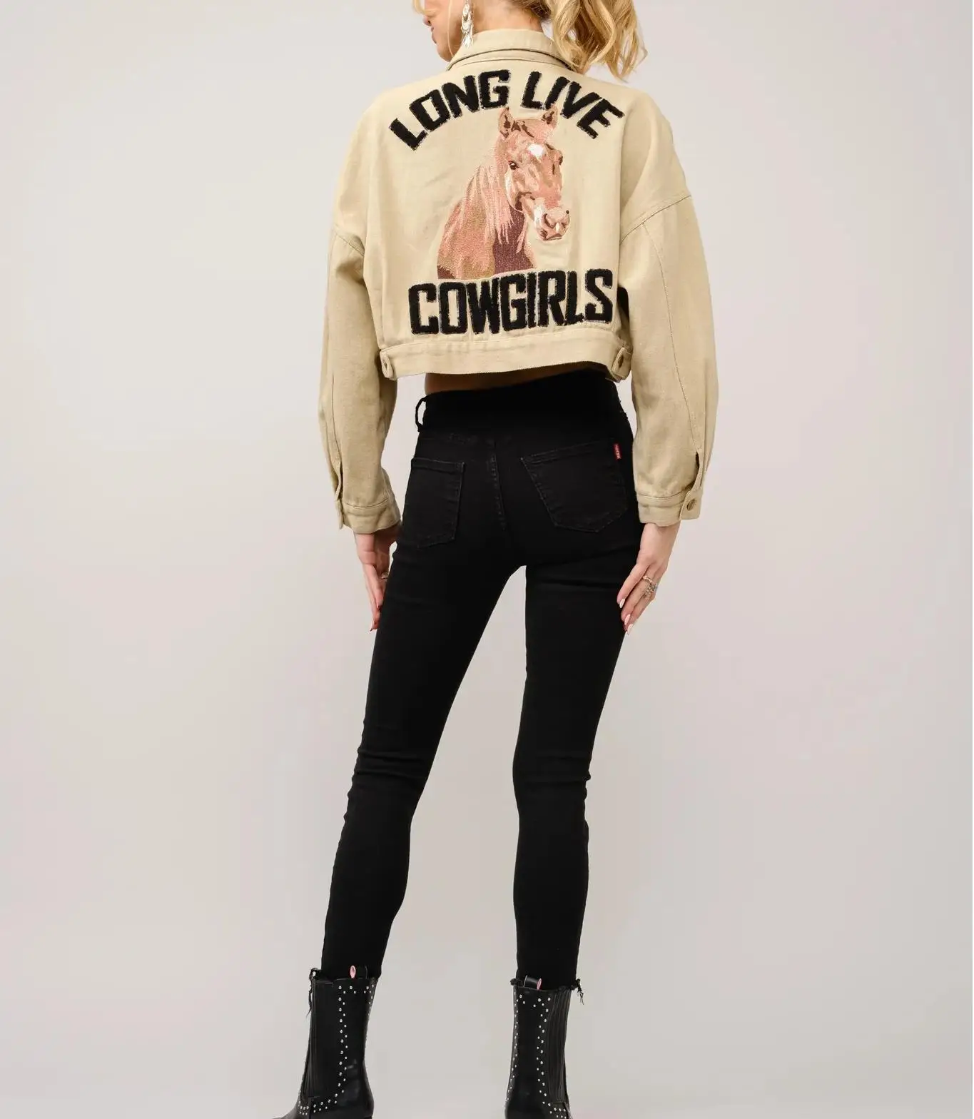Custom Best Selling Women's Crop Top Jacket Washed with Embroidery and Cow Girls Print Oversized Coat for Women