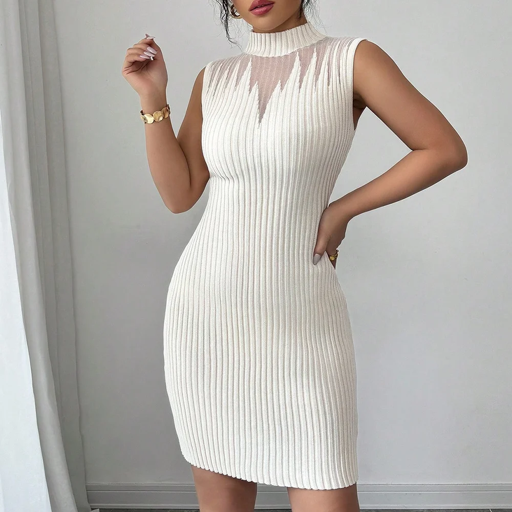 Hot Sale Customized Women's Slim Summer Mini Dress Sleeveless Rib Knitted Bodycon Simple Breathable Vintage Natural Color