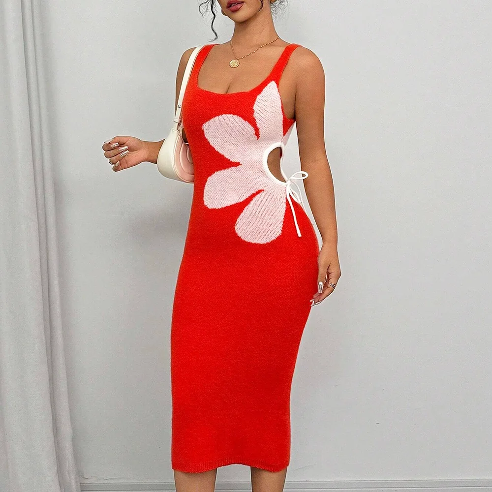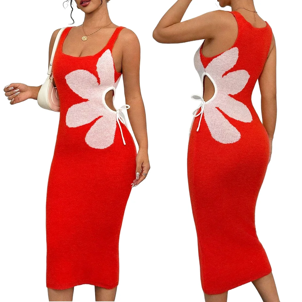 Elegant Women's Floral Print Solid Casual Bodycon Knitted Summer Party Floor-Length Sweater Large Flower Hollow Sleeveless