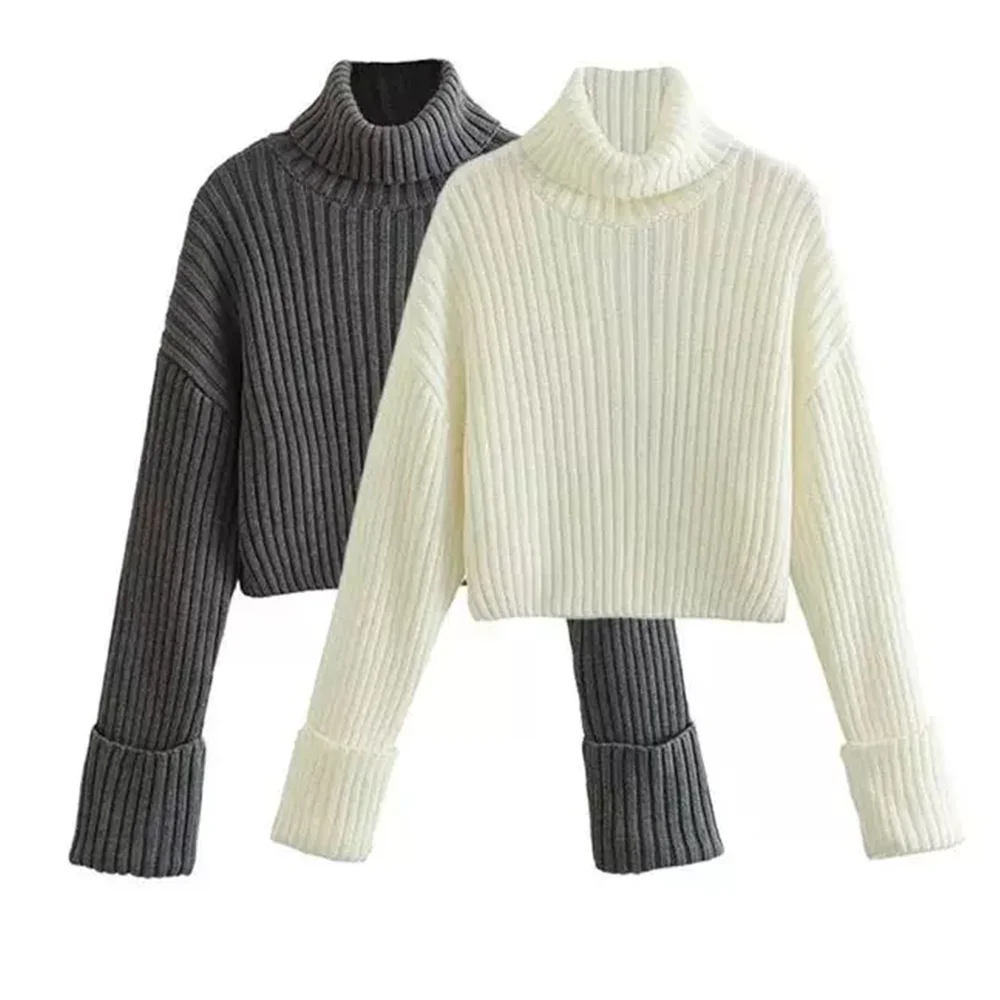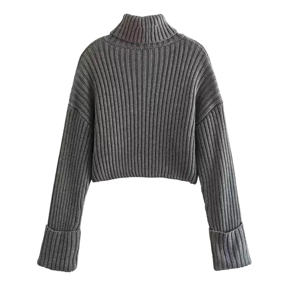 Hot Sale Women's Crop Top Ribbed Knitting Solid Turtleneck Cable Knit Long Sleeves Breathable Winter Warm Sweater Mujer Casual