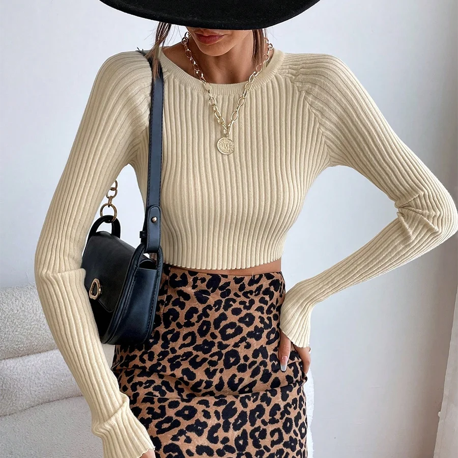 Factory Customizable Women's Solid Knitting Rib Slim Crop Tops Long Sleeve Casual Pullover Jumpers Sweater Mujer for Autumn