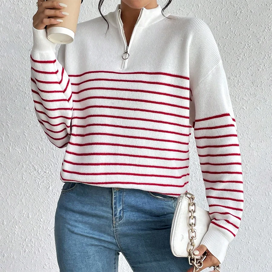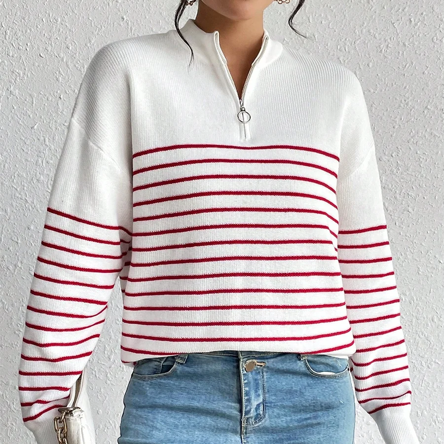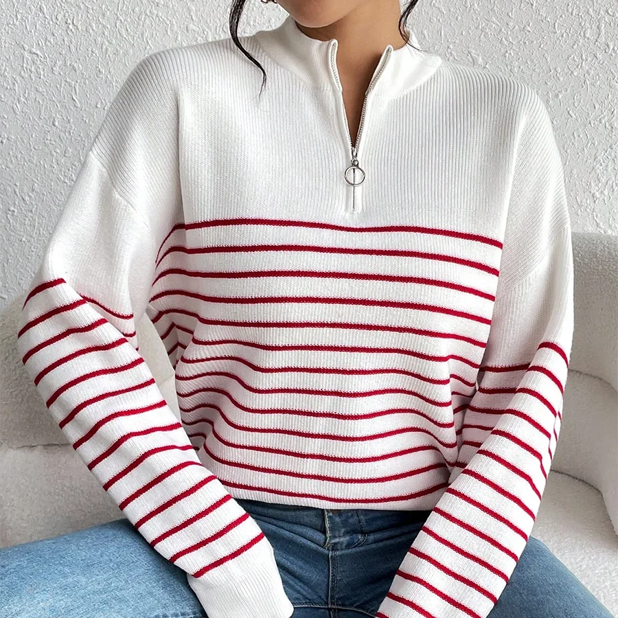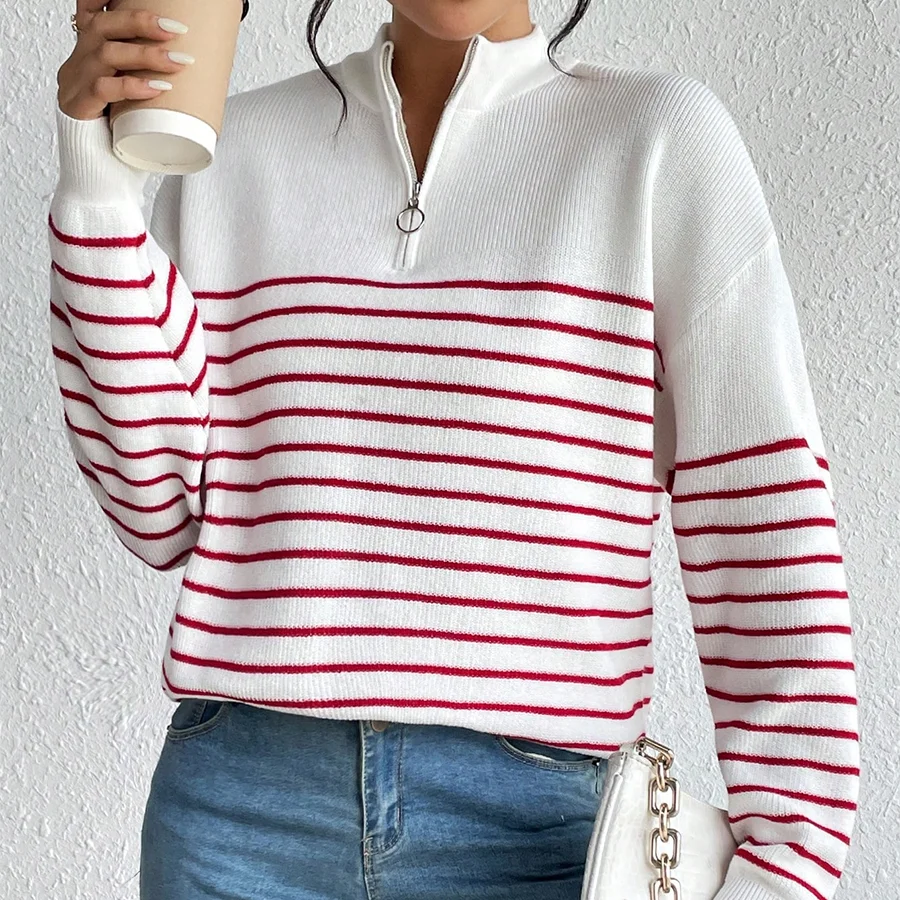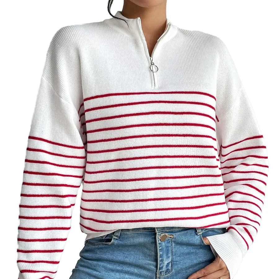 High Quality Ladies Winter Sweaters Custom Striped Knitwear Long Sleeve 1/4 Quarter Zip Pullover Sweater Casual for Women