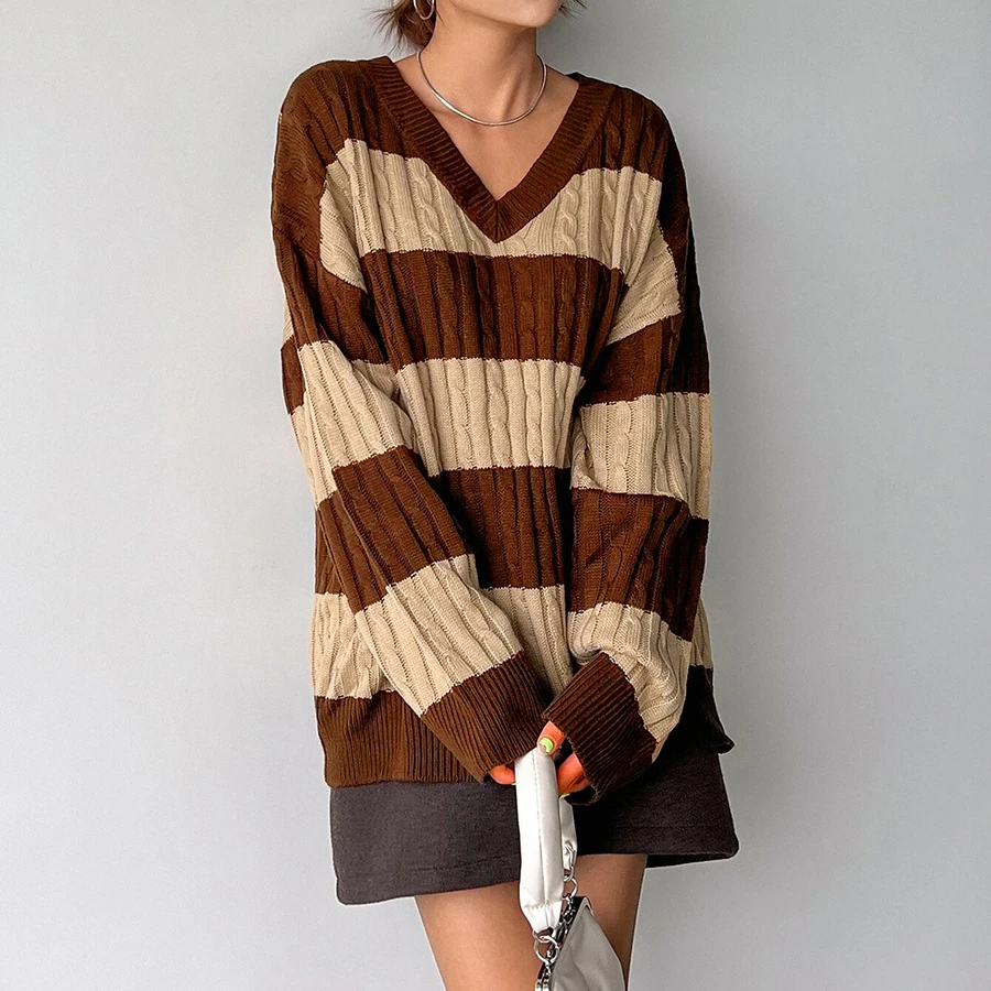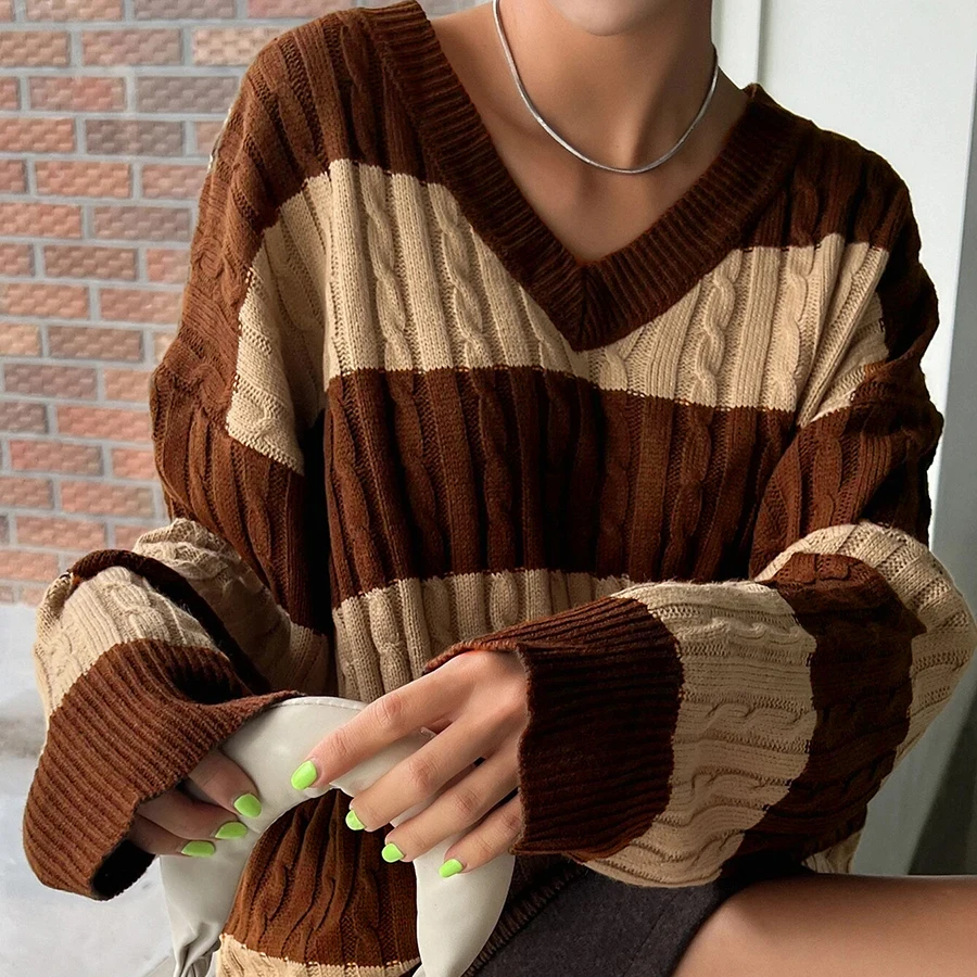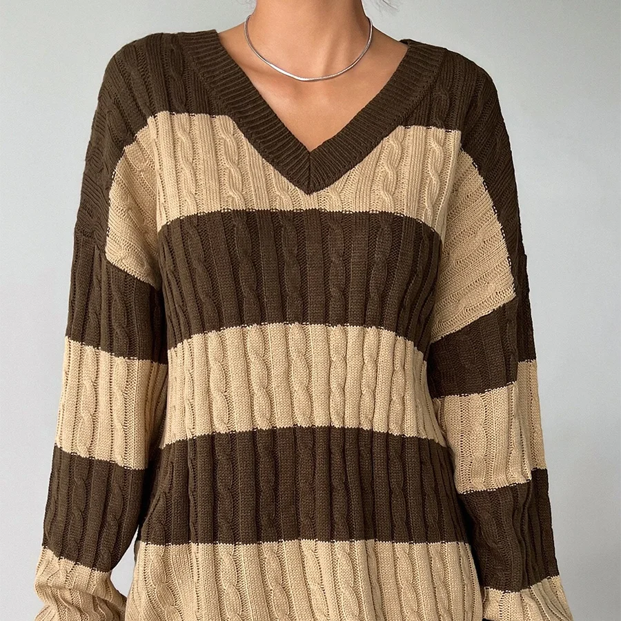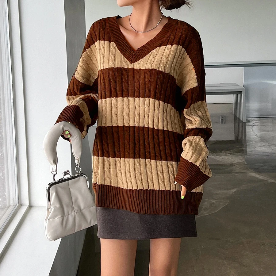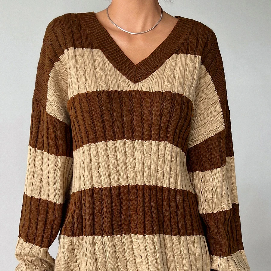 Custom Women Loose Plus Size Striped Knitted V-Neck Pullover Sweater Long Sleeve Casual Knitted Cable Unisex Sweater for Winter