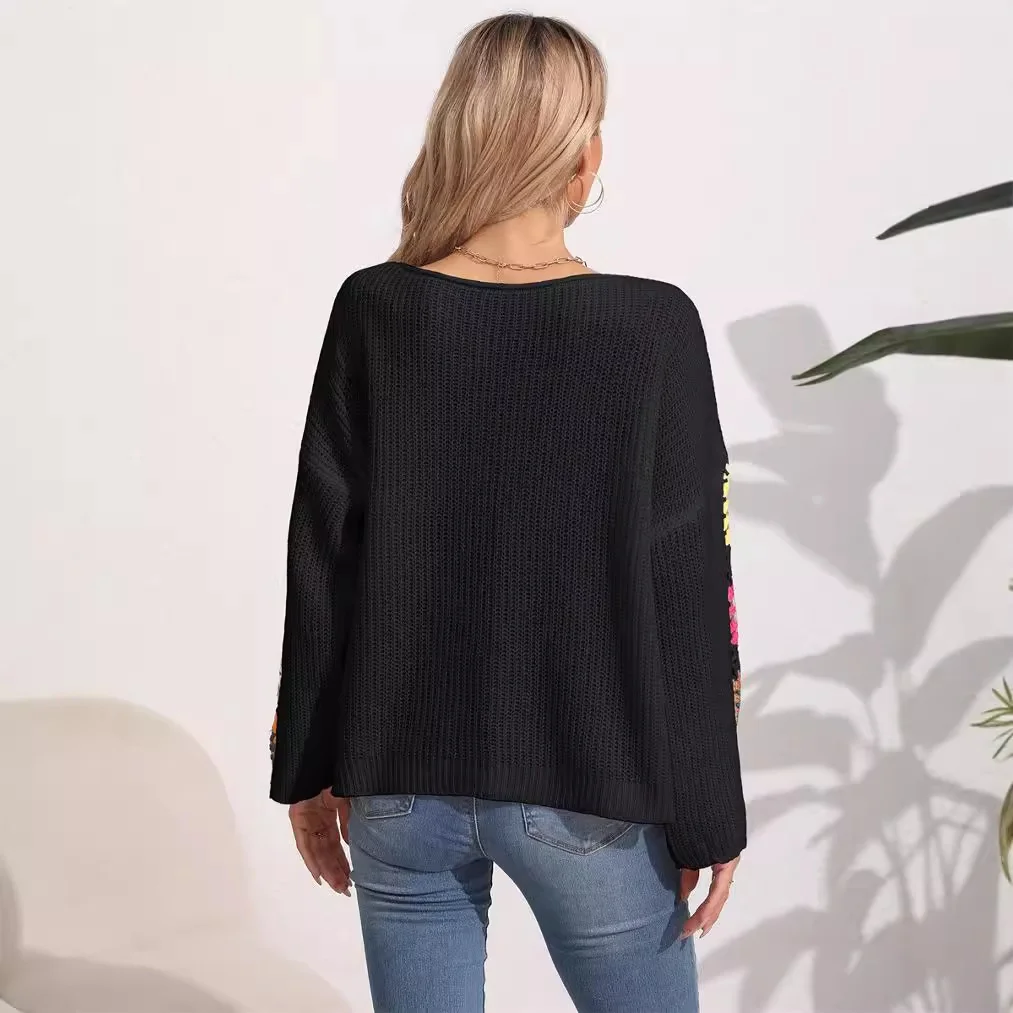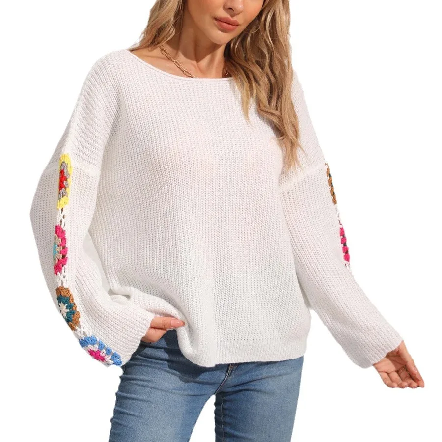OEM Customizable Ladies Winter Jumper Sweater Loose Pullover Floral Cable Knit Crochet Sleeves Beautifully Decorated Flowers