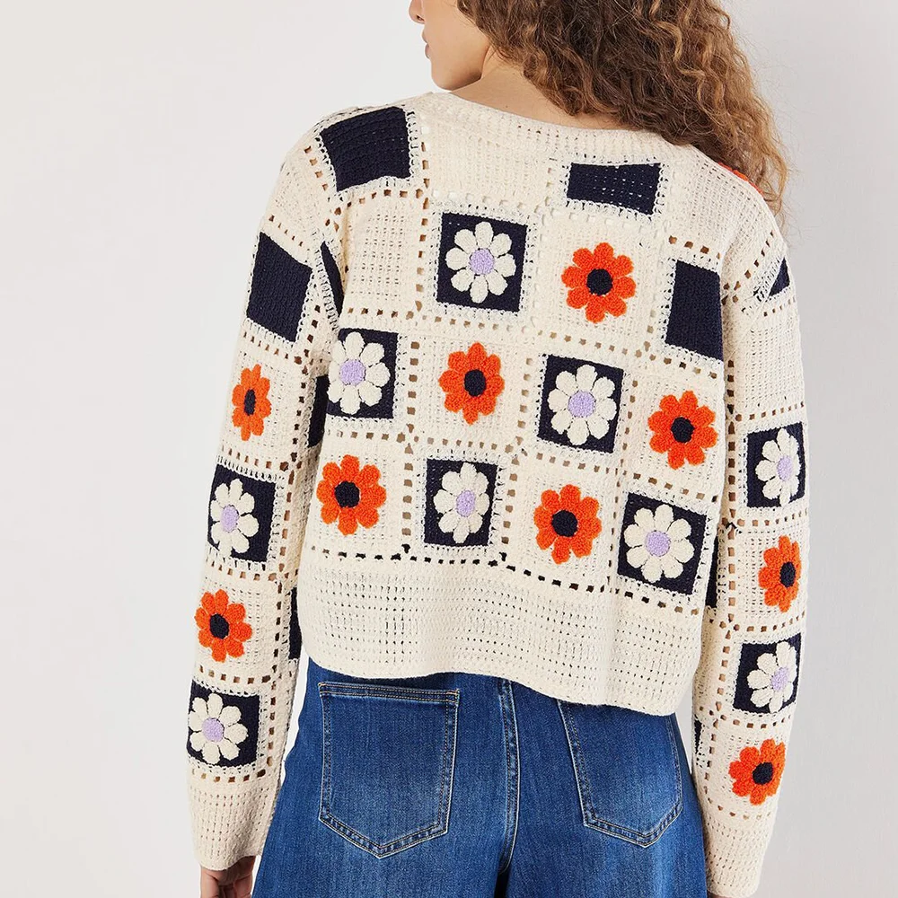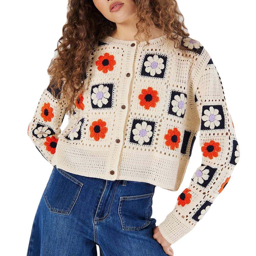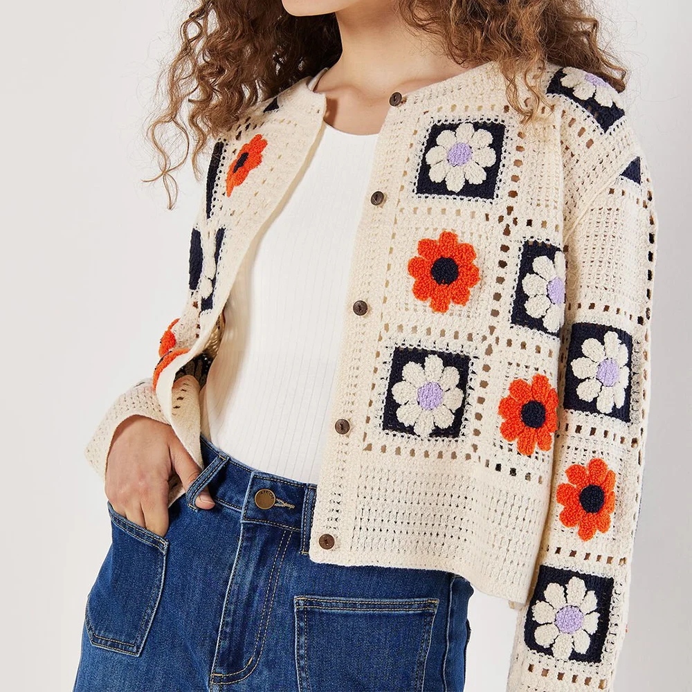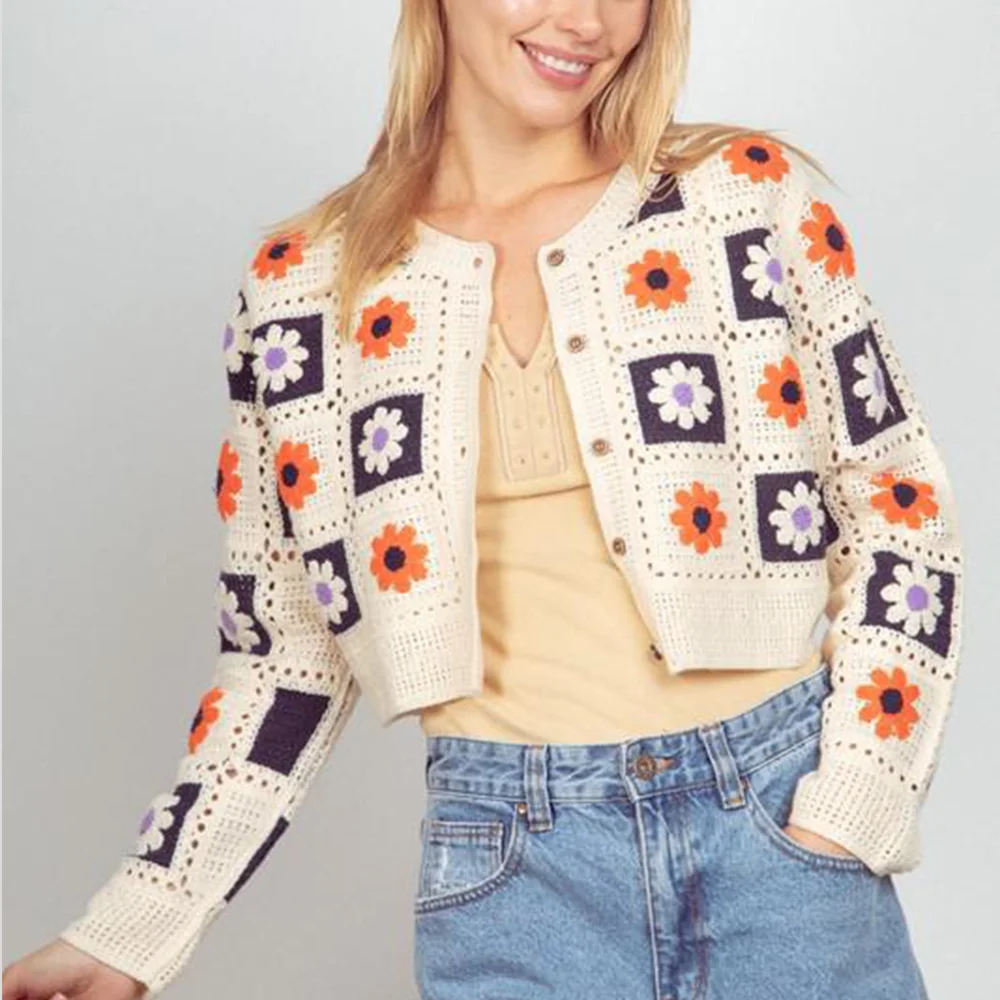 Custom Oem Girls Spring Jacquard Flower Knitwaer Sweater Cardigans Bangkok Overs Crew Neck Crochet Sweater Knit Cardigans Women