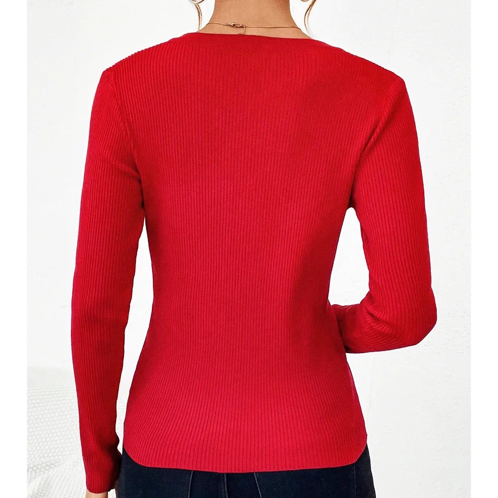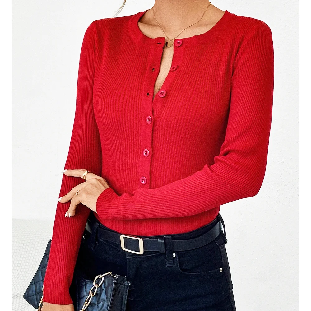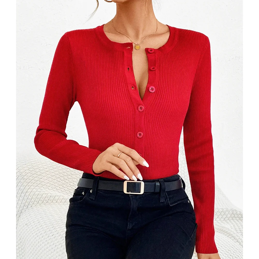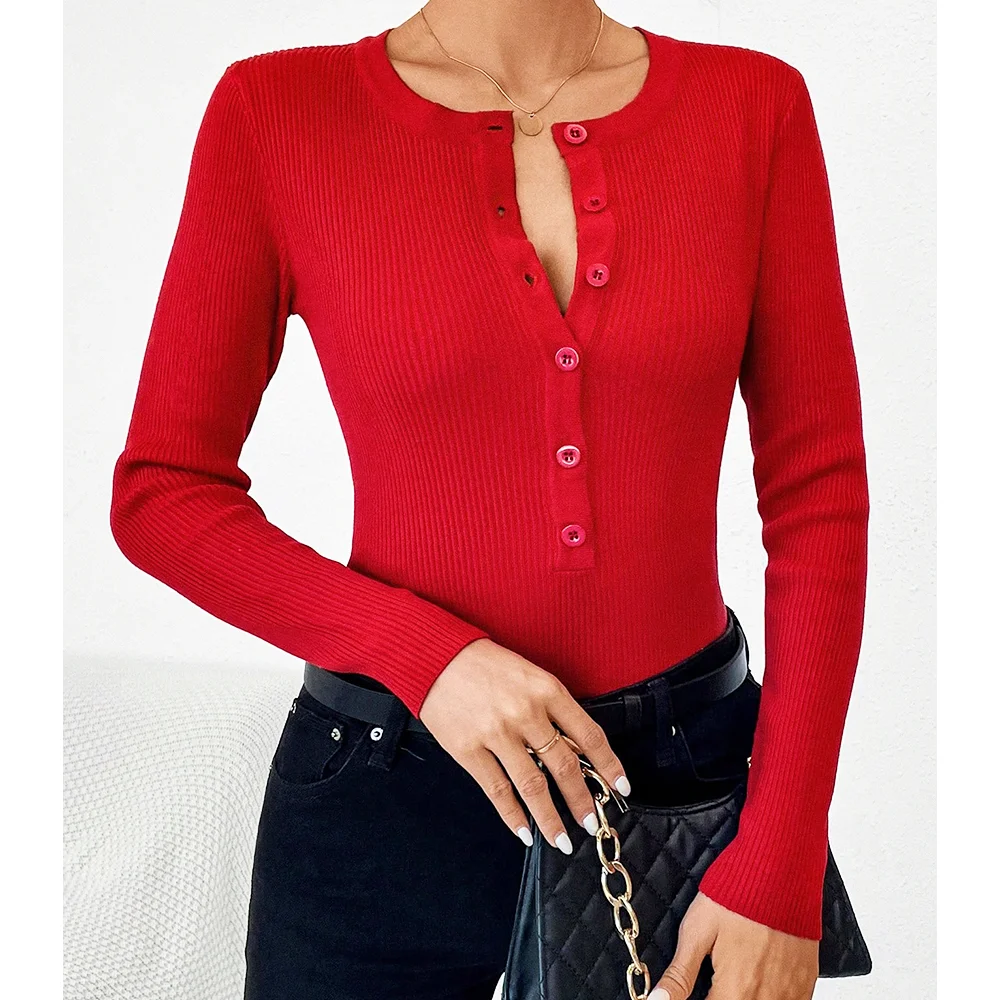 Custom Basic Half Open Chest Women's Pullover with Buttons Ribbed Knit Slim Top Casual Women's Sweater Knitwear for Spring