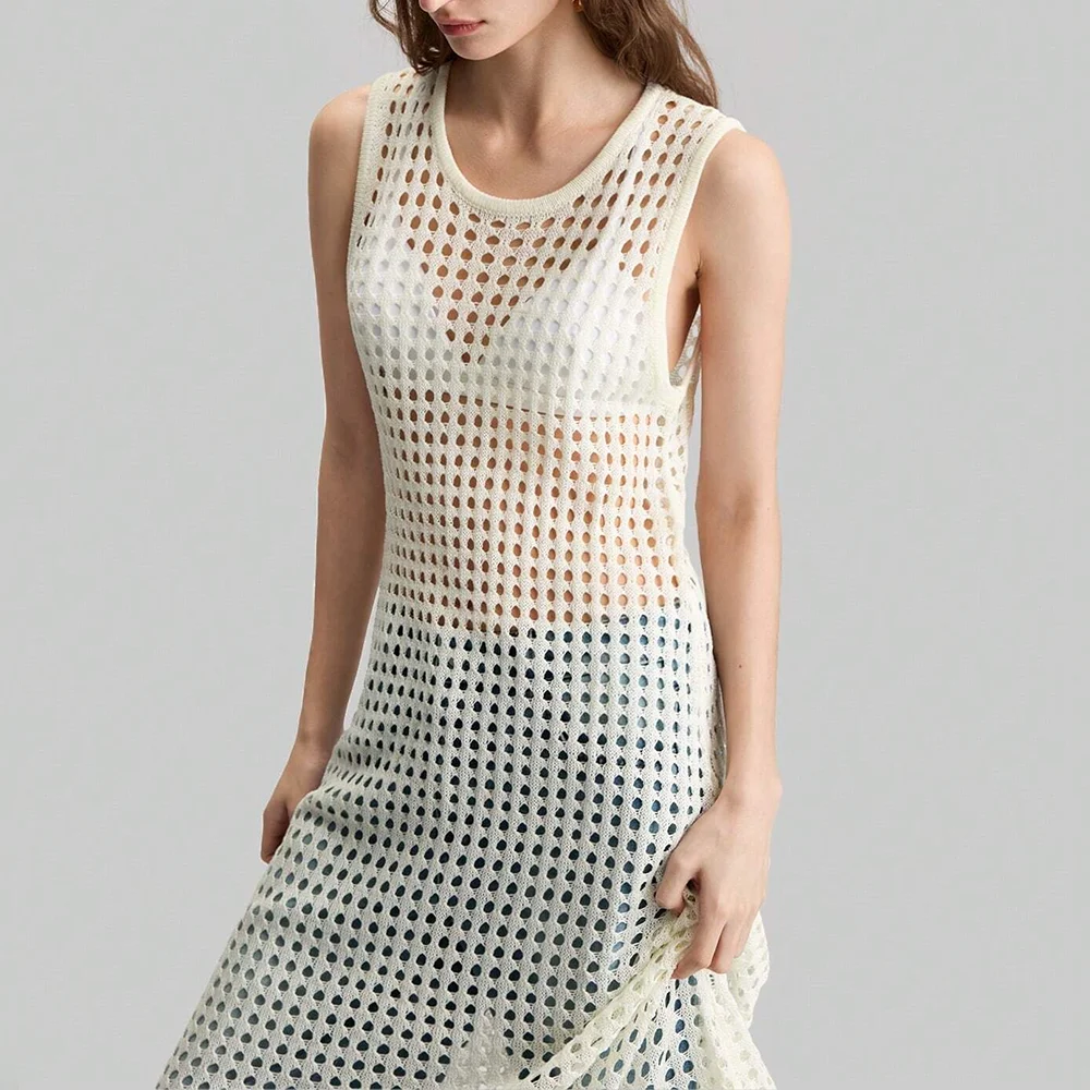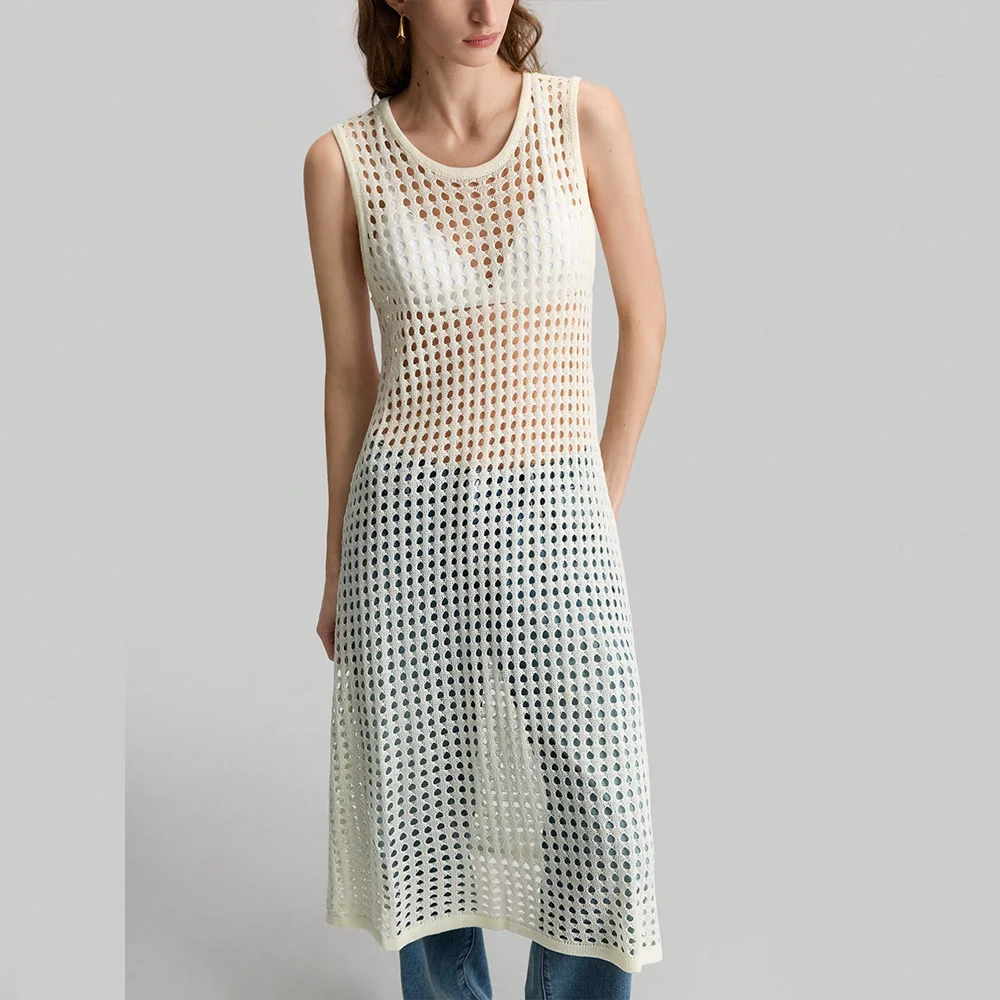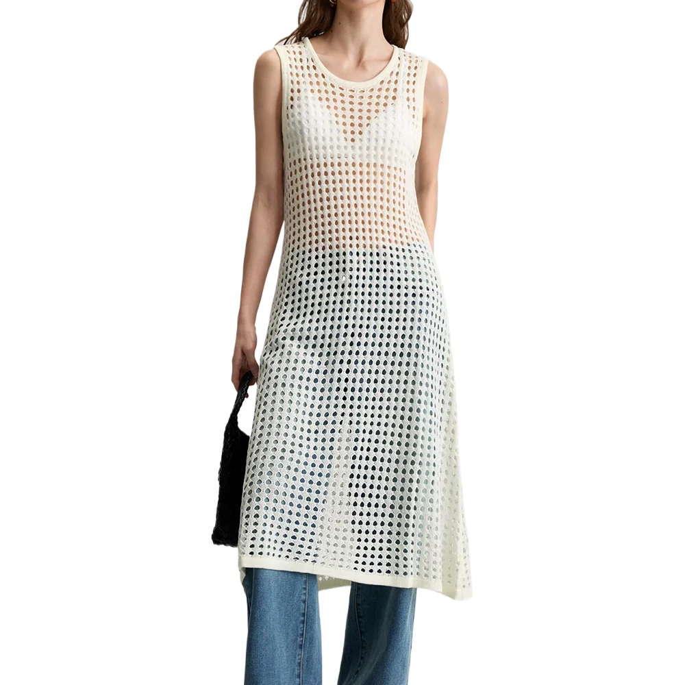 New Arrival Women's Casual Solid Ins Sleeveless Crew Neck Pullover Long Dress Slit Hollow Fishnet Knitted Loose Spring/Summer