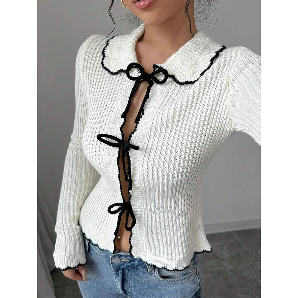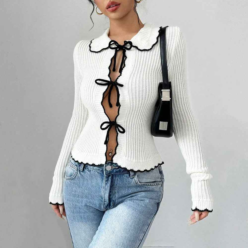 New Arrivals Ladies' Sweet Lace Knit Cardigan Long Sleeves Ribbed Pit-Stripe Knit Lapels Sweater for Spring and Winter