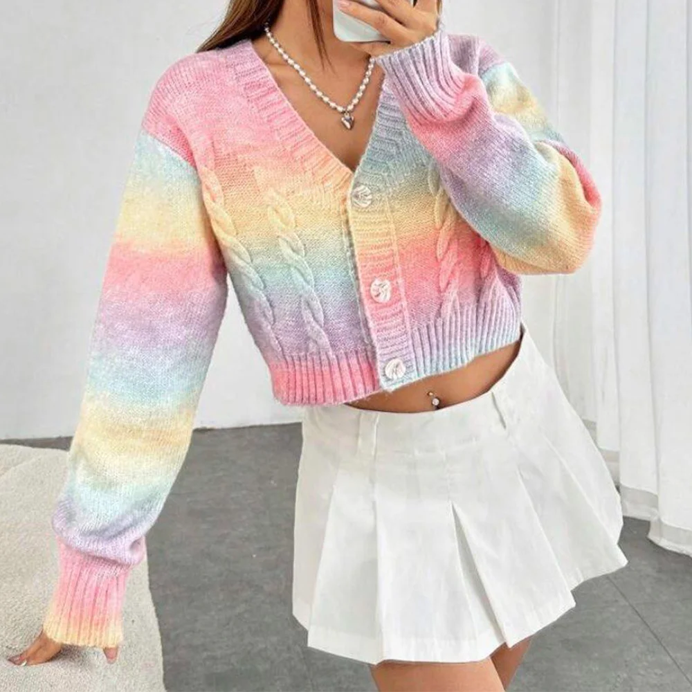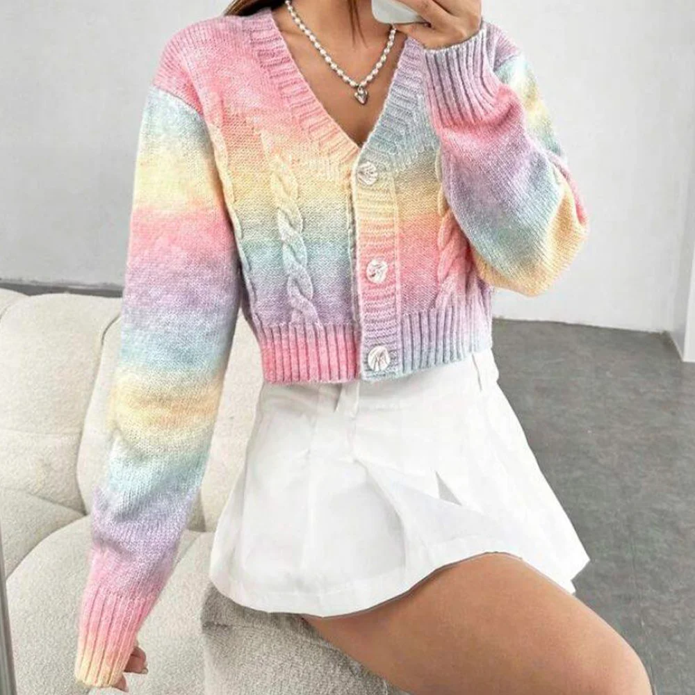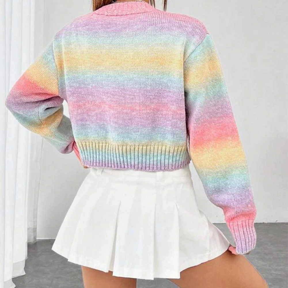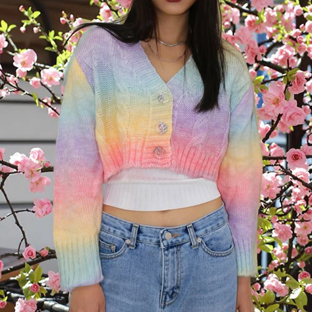 Hot Sale Ladies Cardigan Sweater Coat Rainbow Striped Knitted Crop V-Neck Drop Shoulder Sleeves Button Closure Casual for Spring