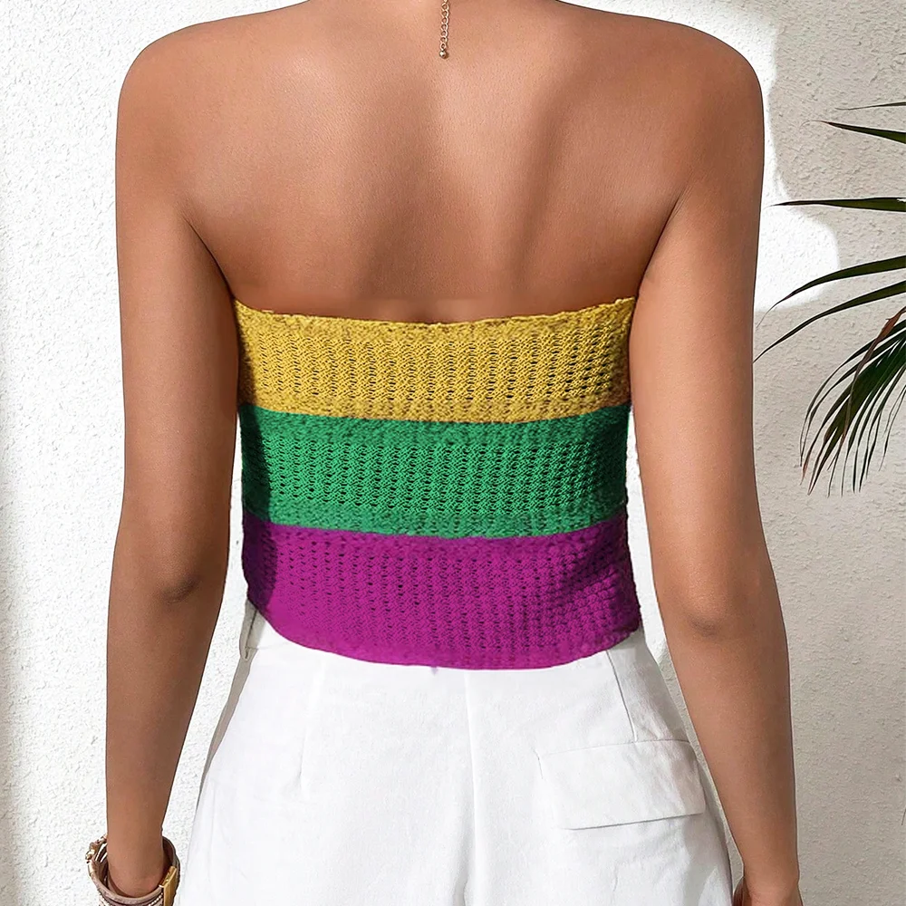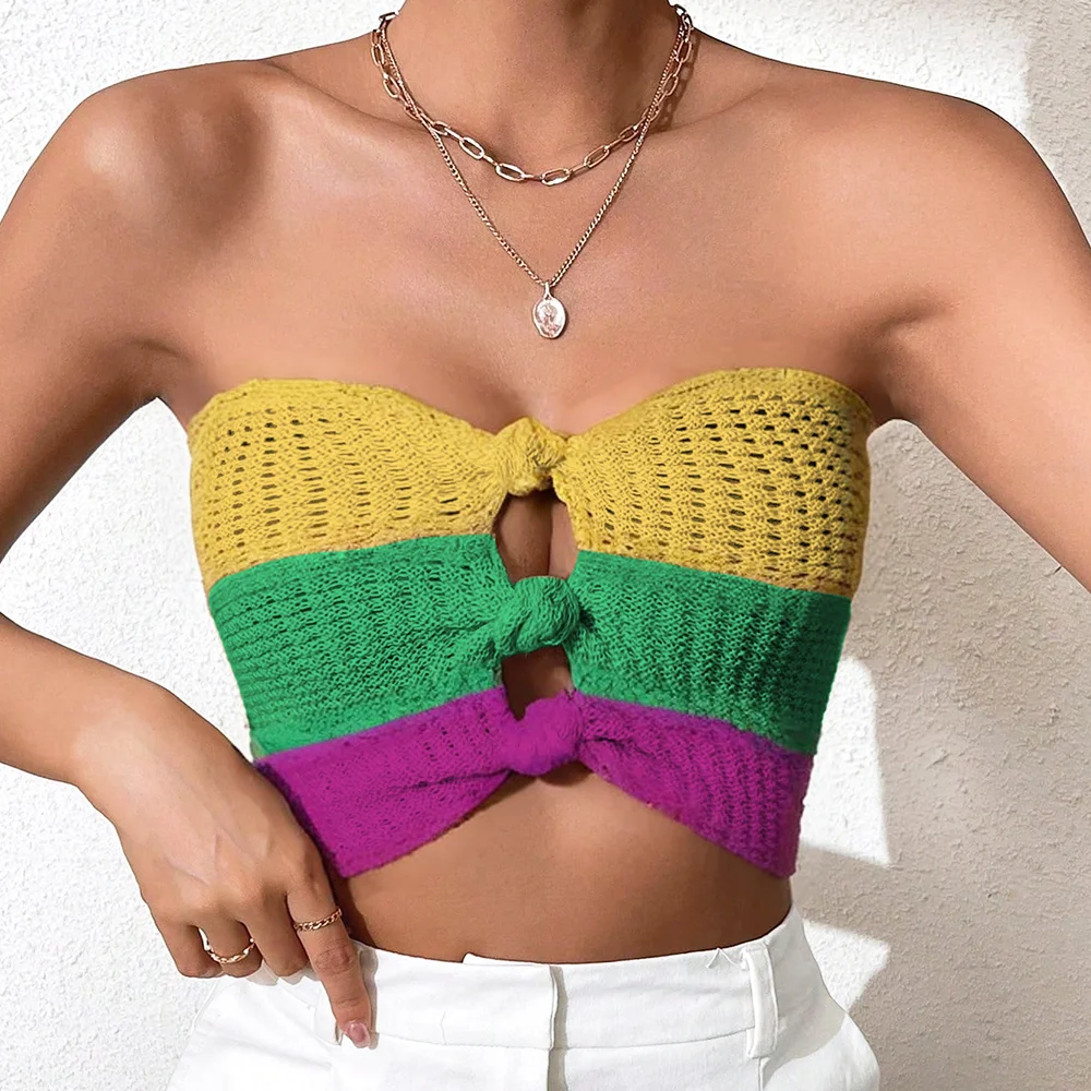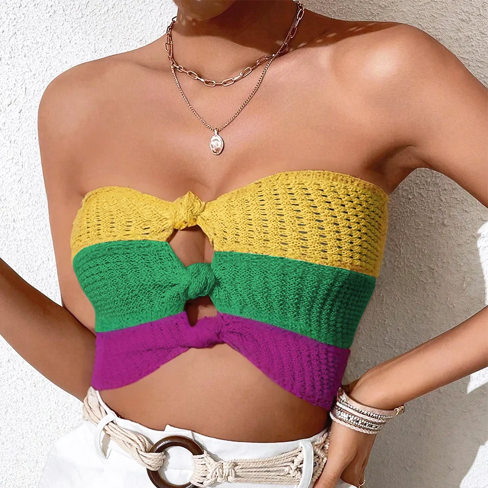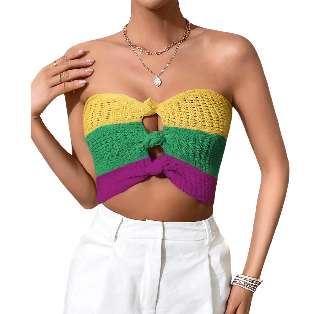 Women's Sexy Strapless Knit Tank Top and Short Bikini Vest Mardi Gras Color Patchwork Swimwear Wholesale Beach Clothing