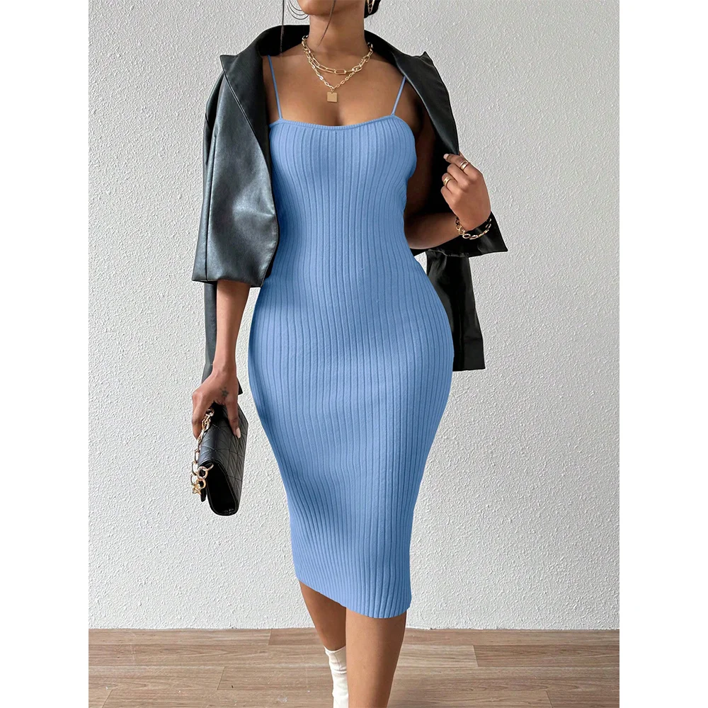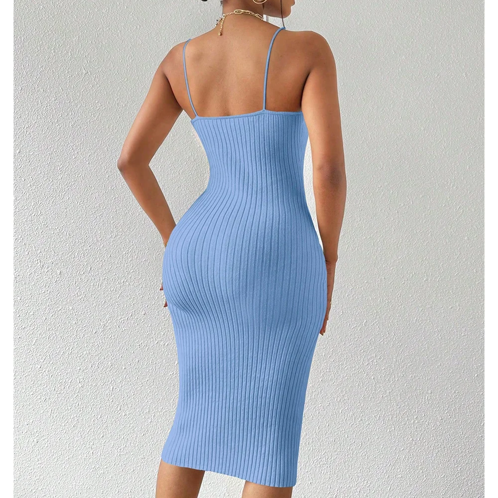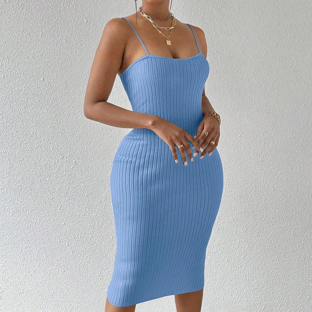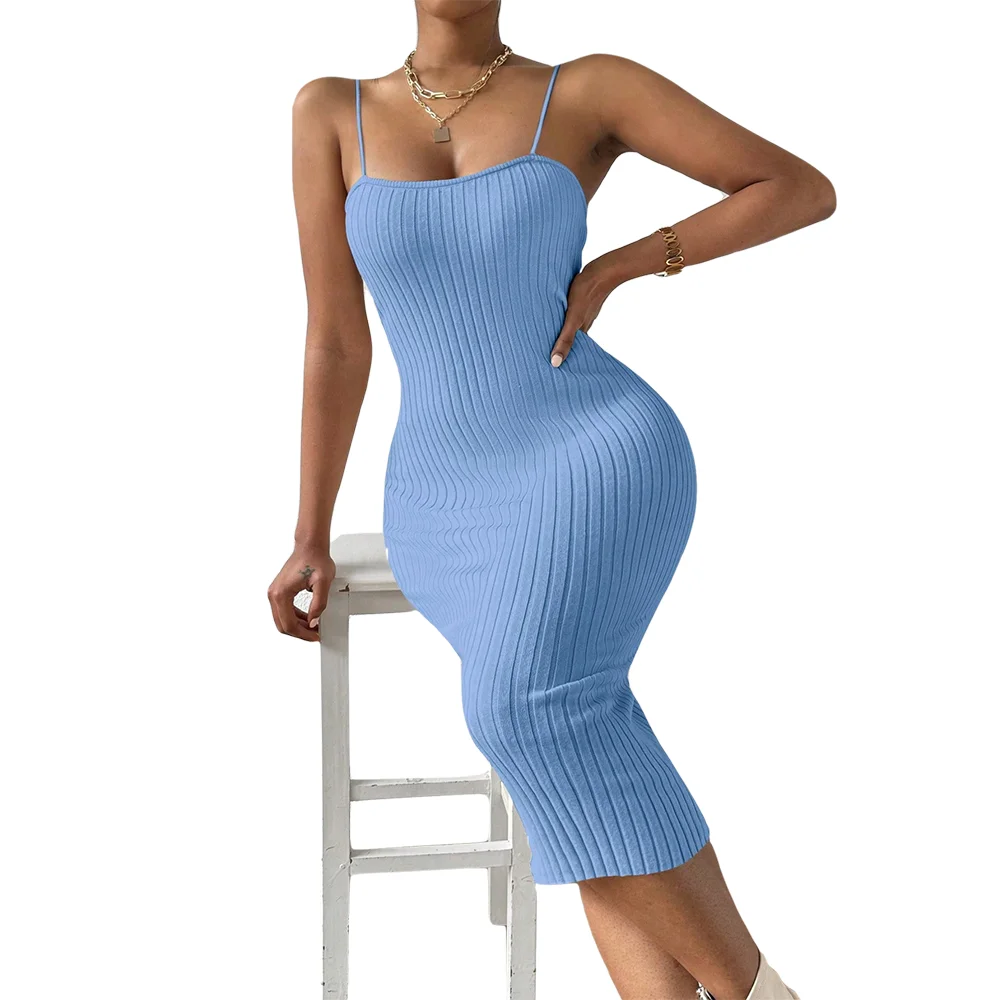 Custom Women's Elegant Solid Color Halter Bodycon Dress Long Casual Knitted Beach Evening Dress Spaghetti Strap for Summer