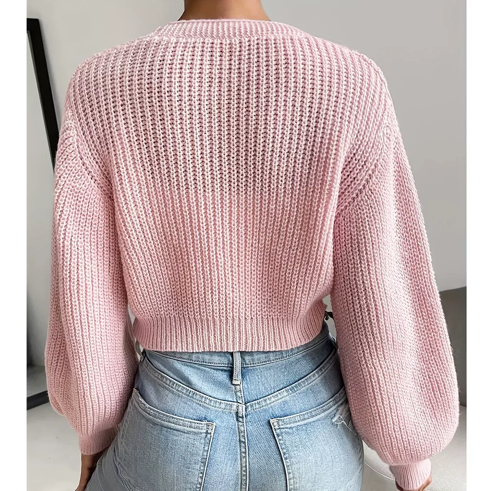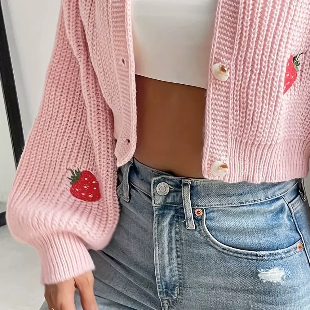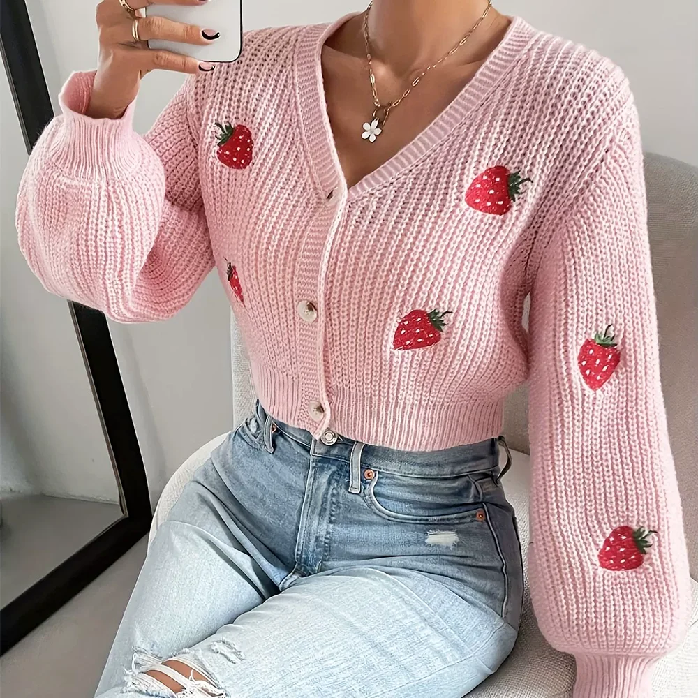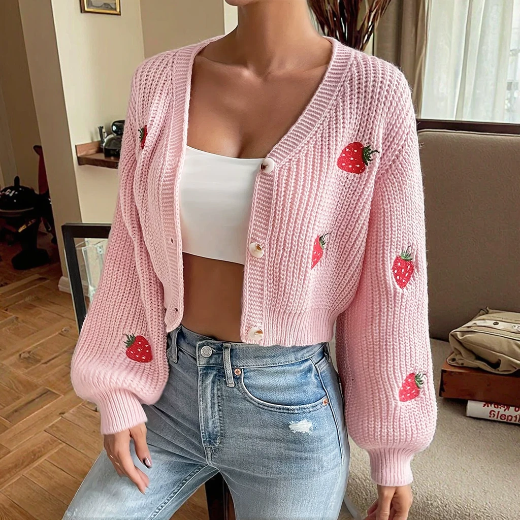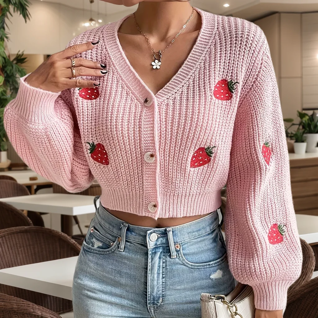 Customized Ladies Long Sleeve V-Neck Cardigan Solid Acrylic Sweater Embroidery Pattern Autumn Winter Knitted Short Sweater
