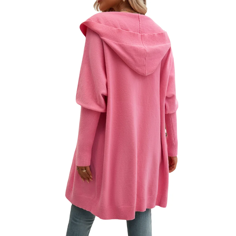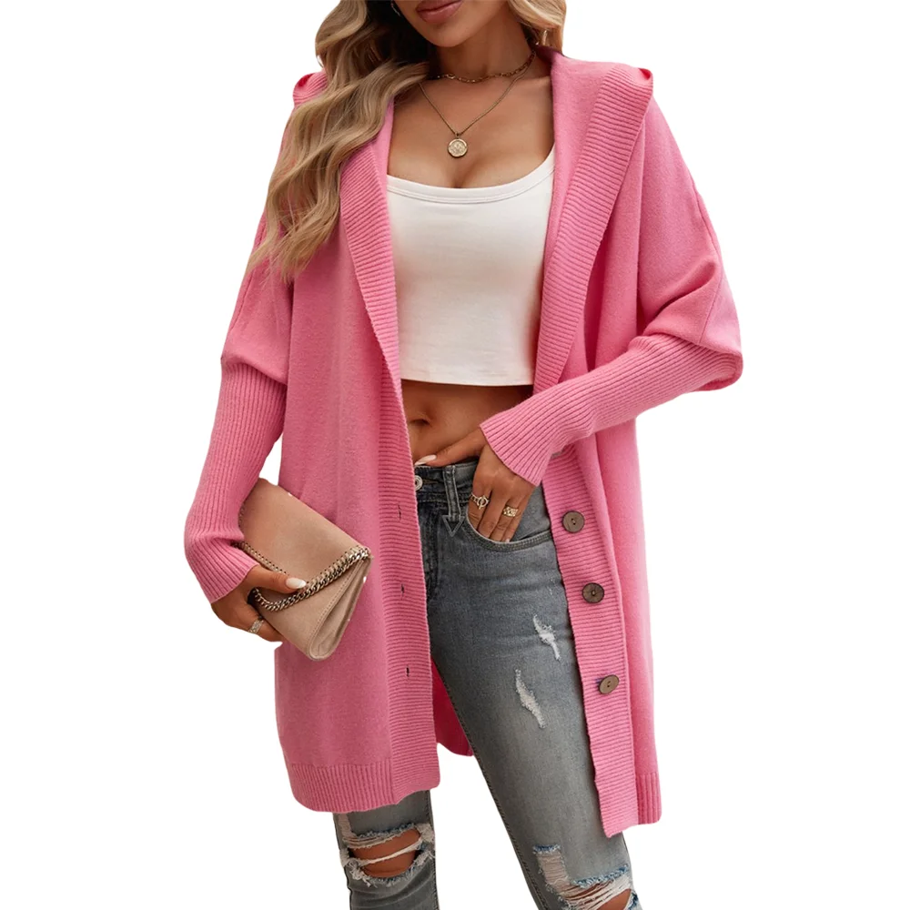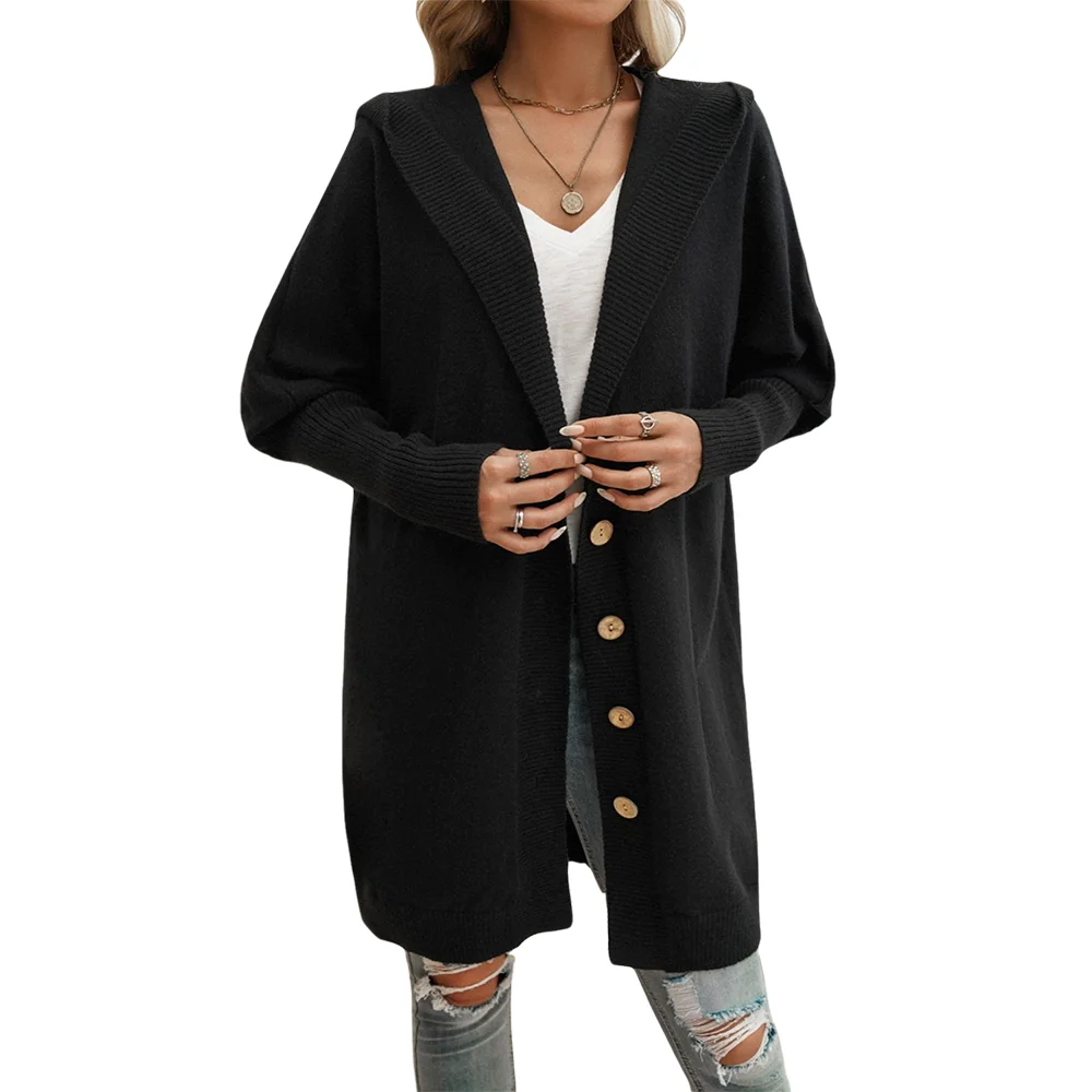 Hot Sale Casual Women's Cardigan Sweater Autumn Winter Warm Medium-Length Hooded Jacket with Solid Color Ribbed Knit Buttons